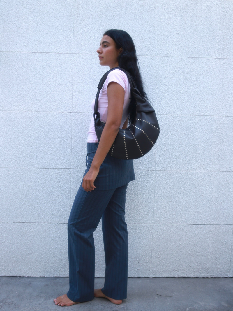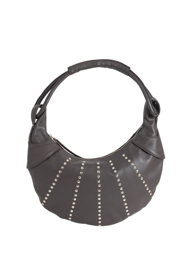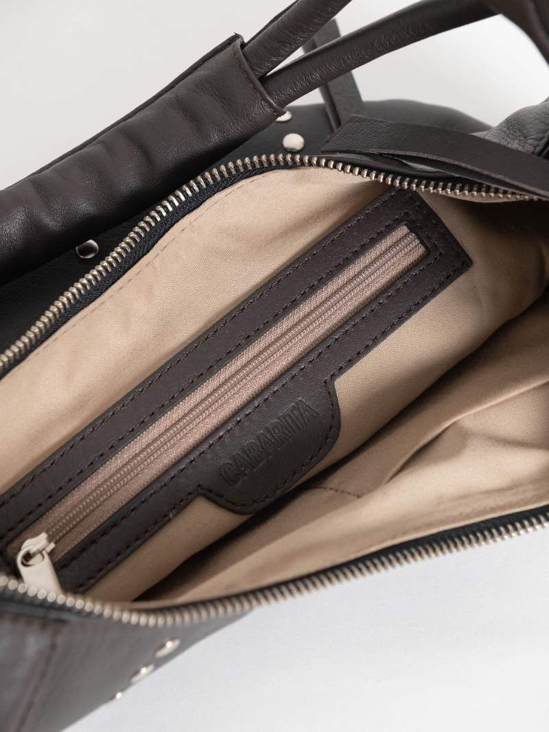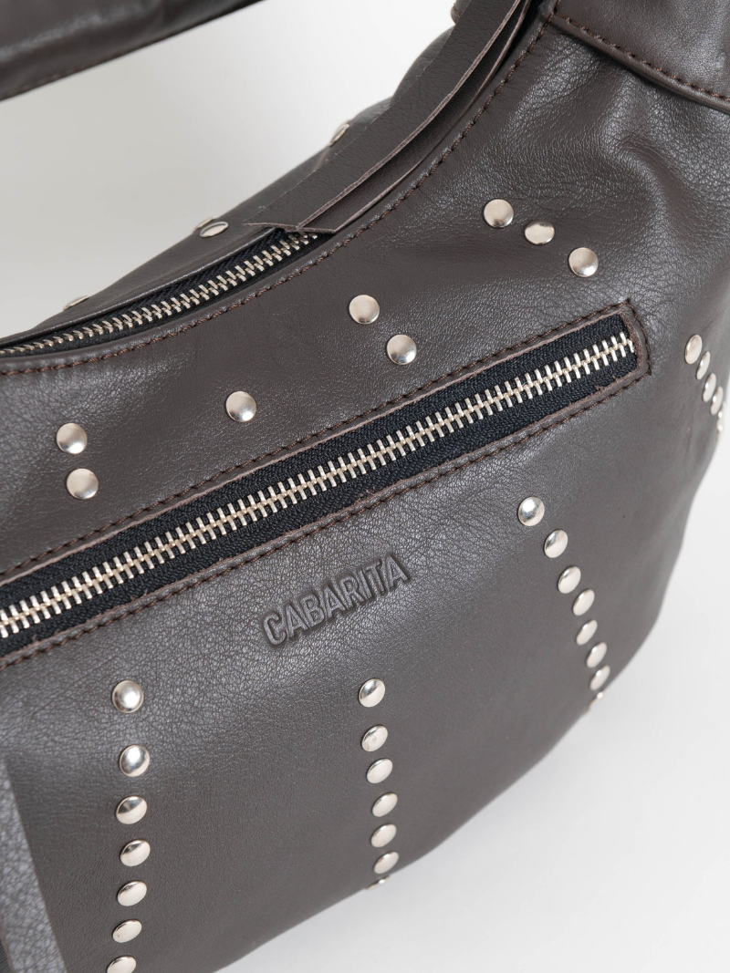 Bolso de hombro de piel marrón con detalles de tachuelas plateadas en la parte frontal y trasera. Su interior, forrado en un tejido resistente y lavable, está pensado para acompañarte en el día a día.