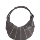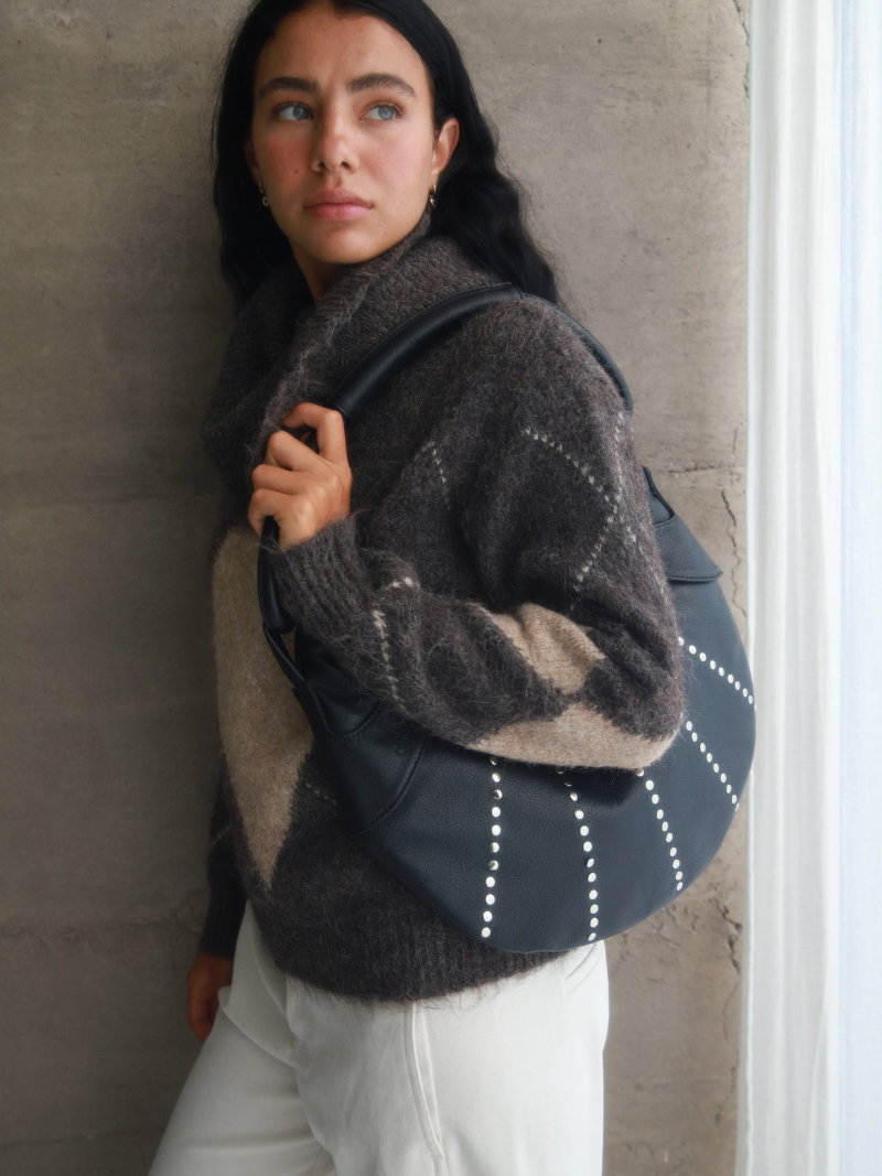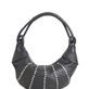 Bolso de hombro de piel negra con detalles de tachuelas plateadas en la parte frontal y trasera. Su interior, forrado en un tejido resistente y lavable, está pensado para acompañarte en el día a día.