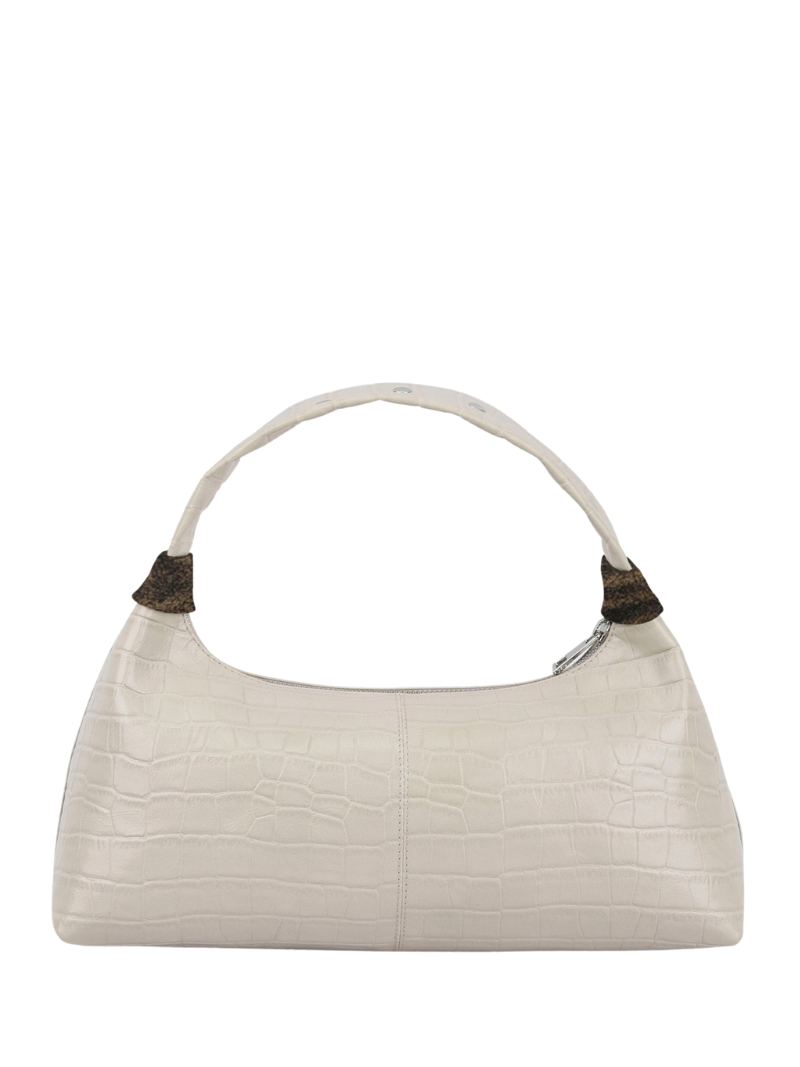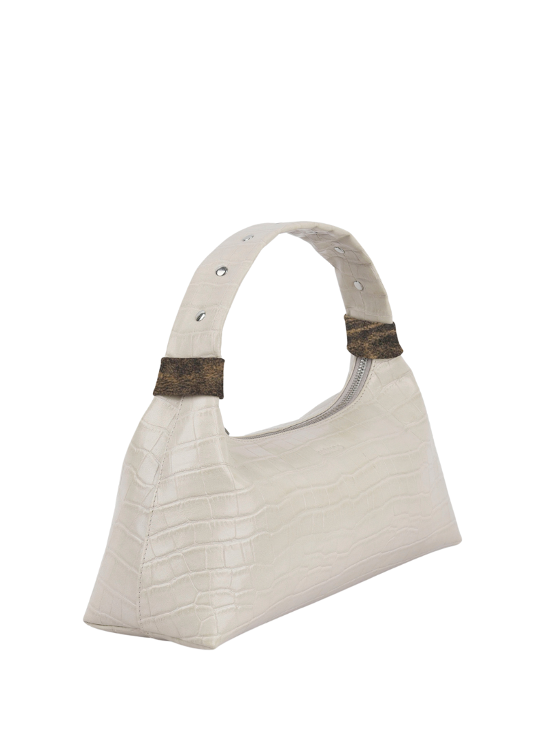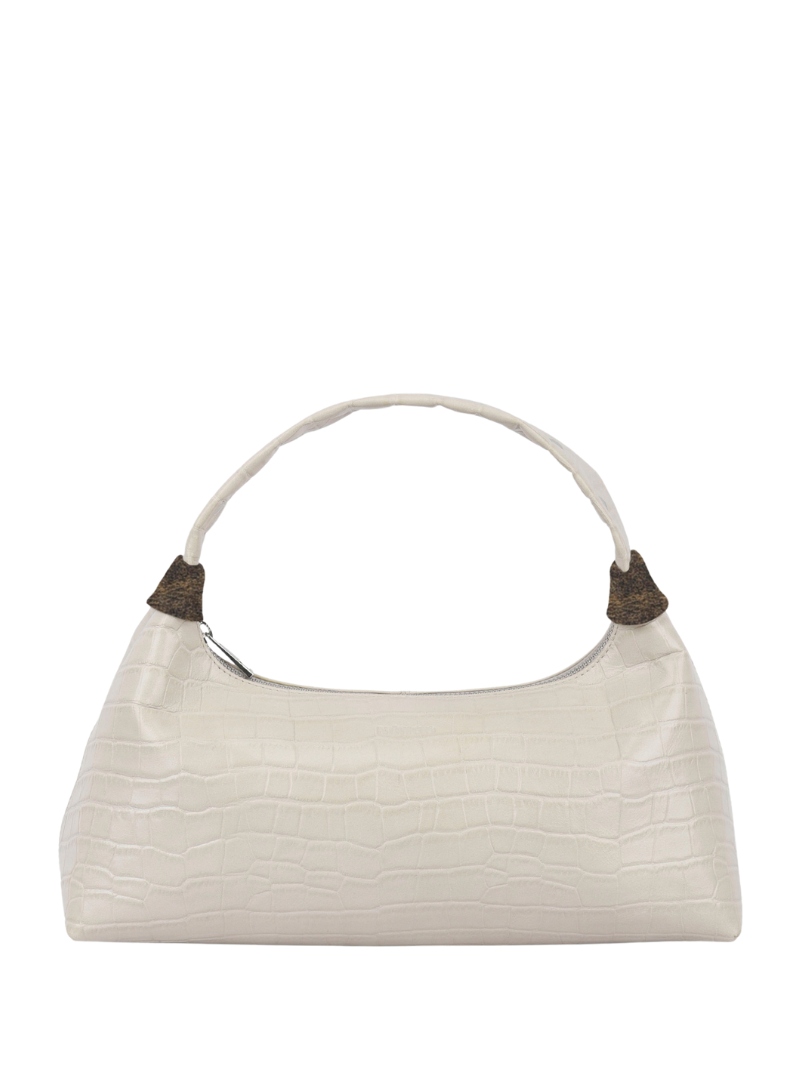 Bolso mediano de hombro de piel en color blanco roto con asa circular en la parte superior y cierre con cremallera hasta el tope.