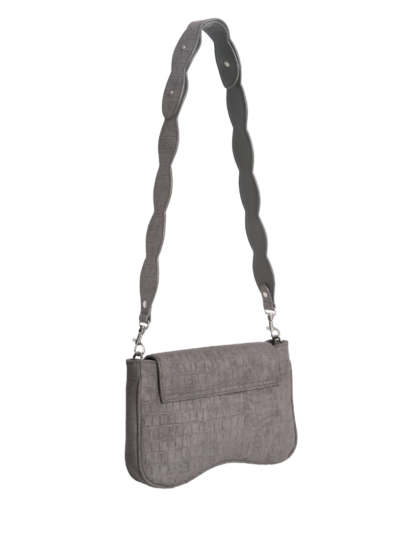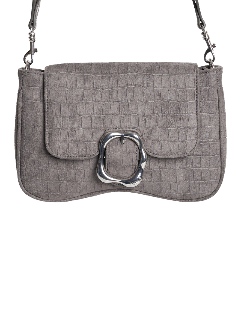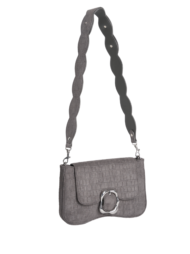 Bolso mediano cruzado gris con acabado efecto cocodrilo y el característico cierre metálico melted en la parte frontal, uno de los detalles más reconocibles de It’s Lava.