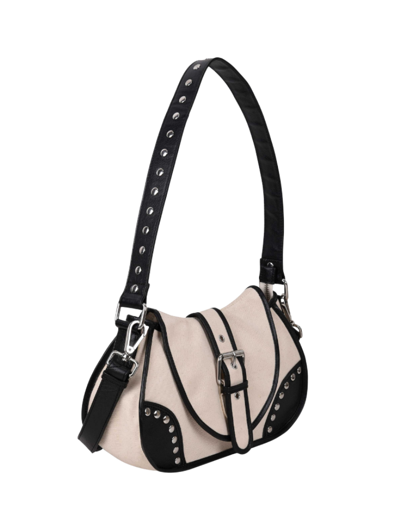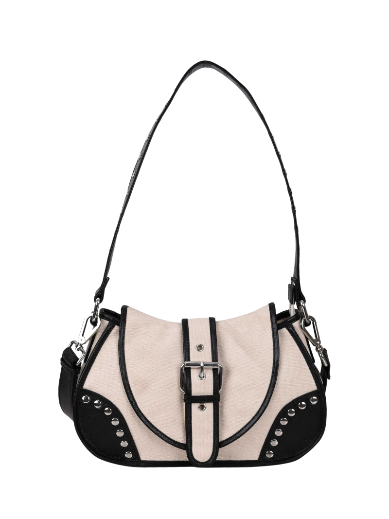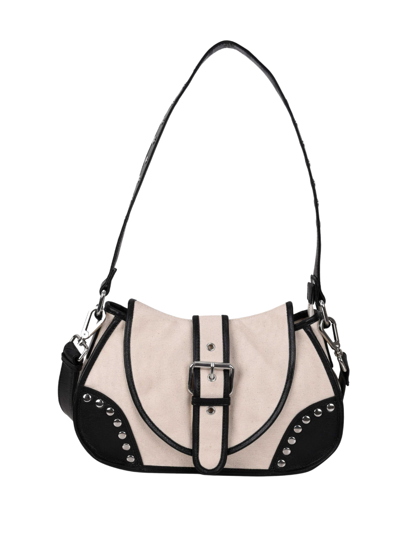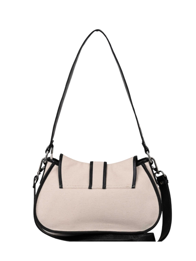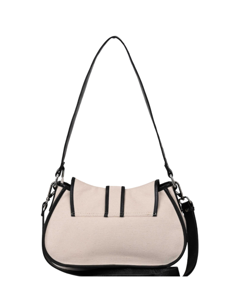 Bolso mediano de tela en color beige y negro con es ese toque especial que va con todo. Su cuerpo en canvas blanco y detalles en piel negra lo hacen moderno y elegante, con acabados en plateado que suman estilo. Ideal para llevar al hombro o cruzado, y con espacio para lo que de verdad necesitas: móvil, cartera, llaves, maquillaje y hasta un paraguas pequeño. Perfecto para tu día a día, sin complicaciones.