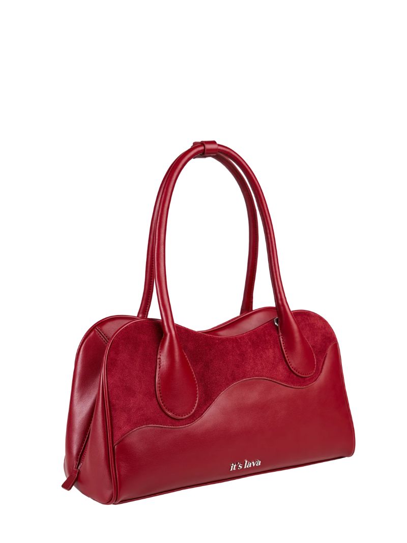 Bolso grande de hombro con doble asa larga. Confeccionado en napa vegana en color granate, combinado con paneles de ante a tono, que le aportan un acabado sofisticado y con mucha personalidad.