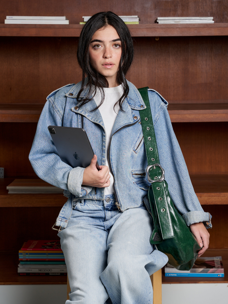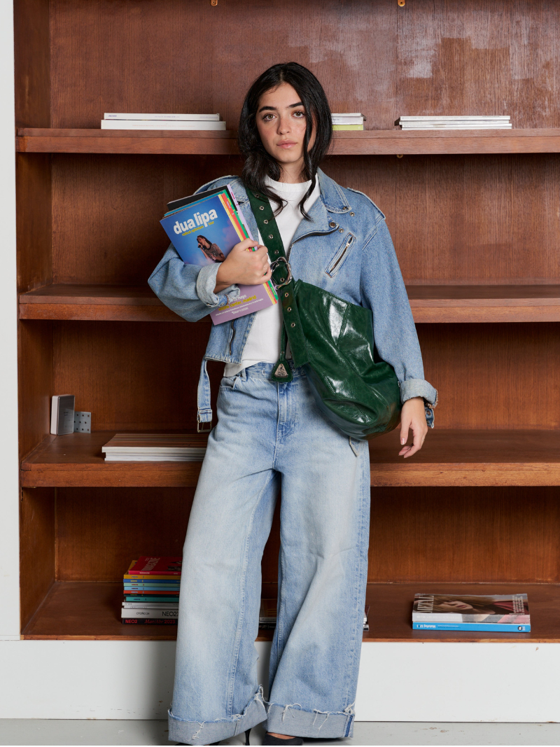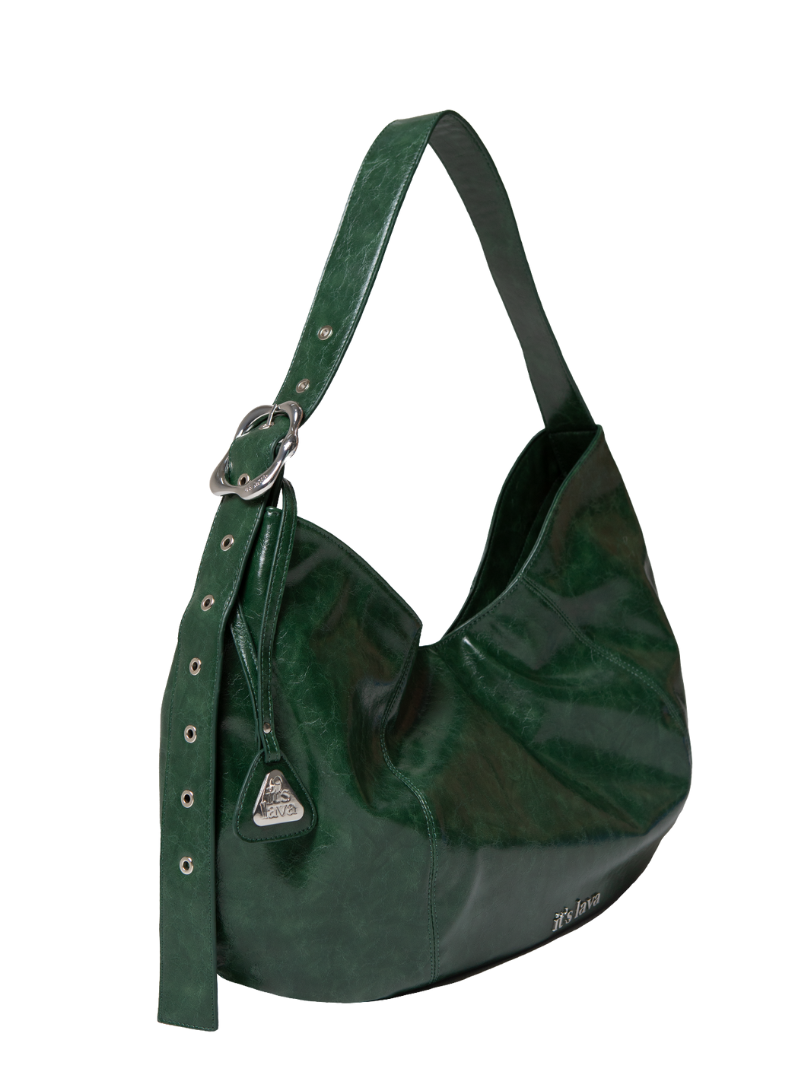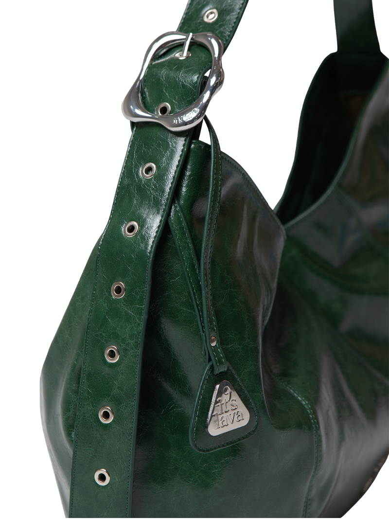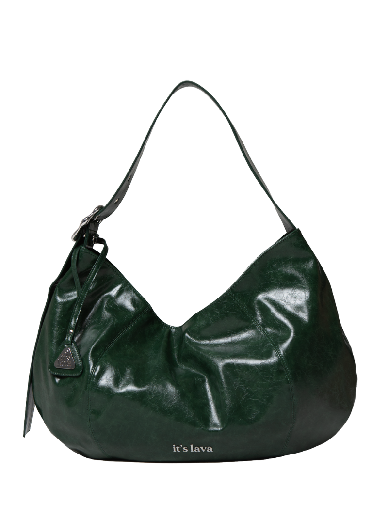 Bolso grande de napa vegana en color verde, pensado para acompañarte en el día a día con un formato amplio y práctico. Cuenta con una asa ajustable para llevarlo al hombro o cruzado, y su silueta flexible se adapta cómodamente al cuerpo. Cierre con cremallera.