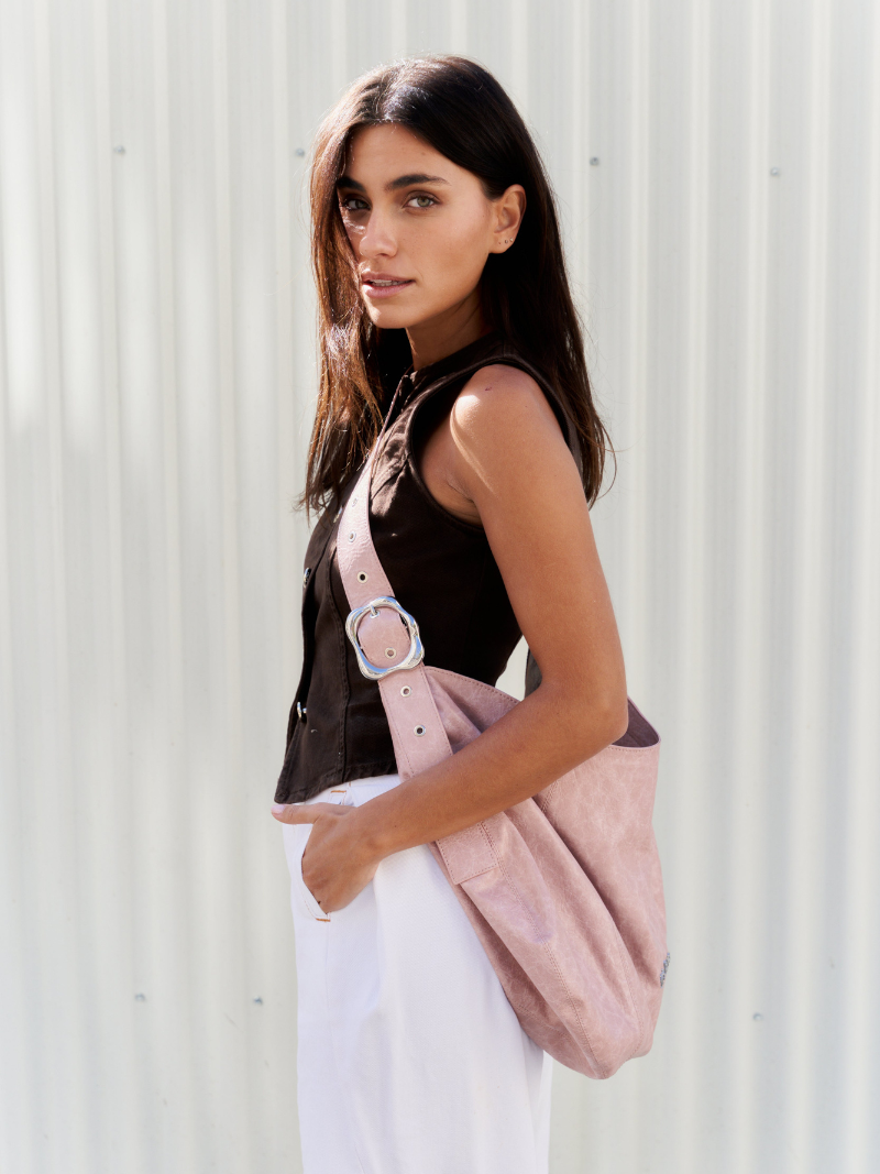 Bolso grande de napa vegana en color rosa claro, pensado para acompañarte en el día a día con un formato amplio y práctico. Cuenta con una asa ajustable para llevarlo al hombro o cruzado, y su silueta flexible se adapta cómodamente al cuerpo. Cierre con cremallera.