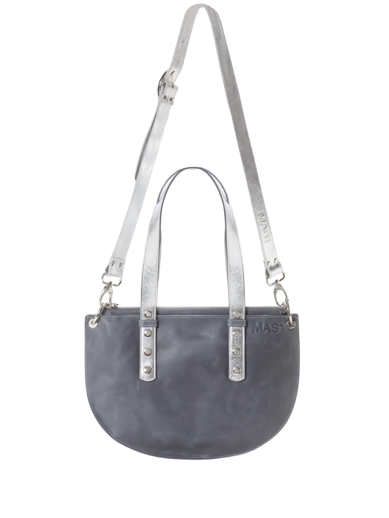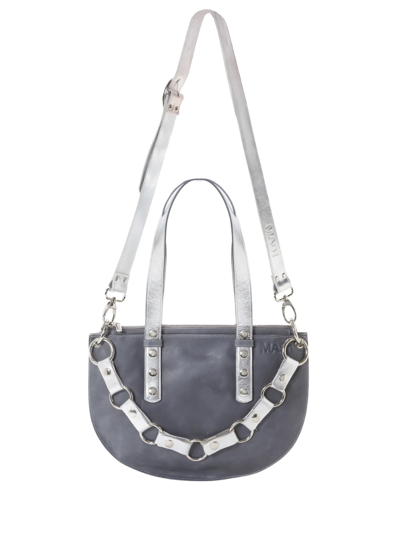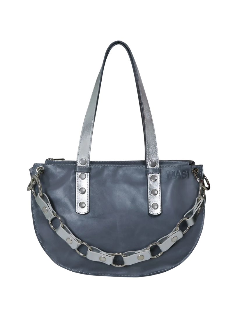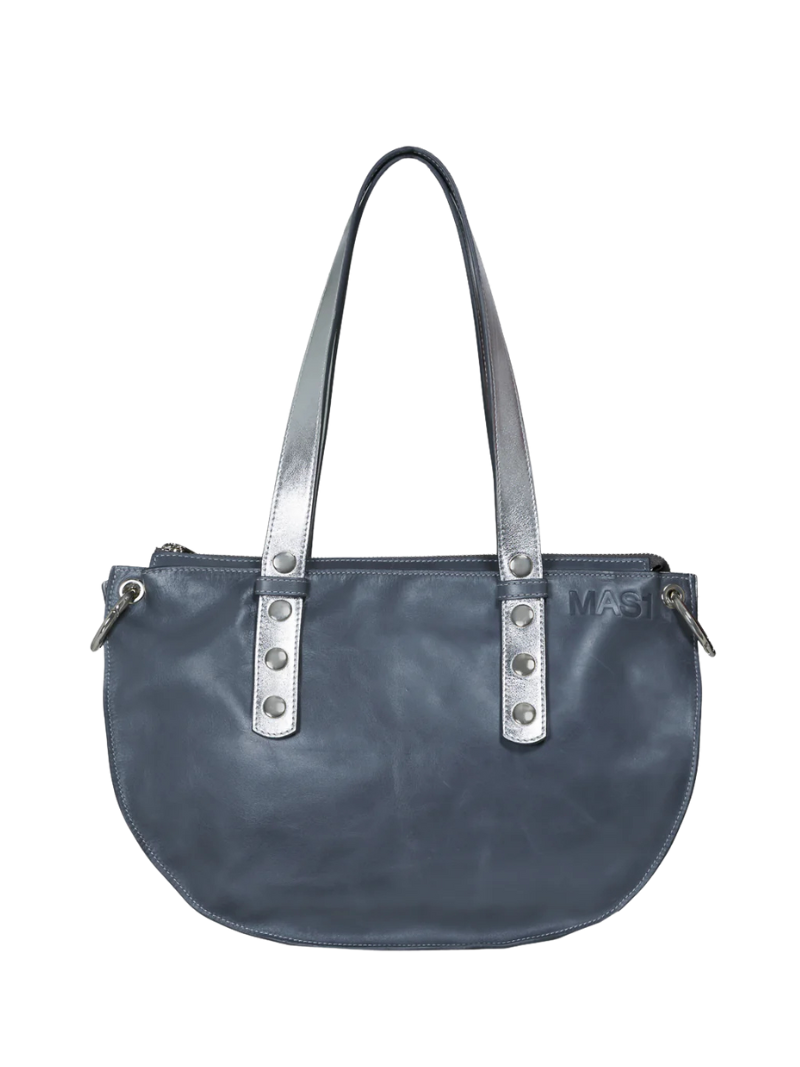 El bolso Mini Andy gris de MAS1  es un bolso elegante y funcional, fabricado en piel de vacuno certificada LWG. Con un diseño en tonos grises y plateado, cuenta con asas ajustables y extraíbles para llevarlo al hombro o cruzado. El logo estampado en la parte delantera y el asa decorativa le dan un toque exclusivo. Perfecto para quienes buscan un bolso compacto y versátil. Bolso perfecto para el día a día . Caben libros, botellas, tuppers de comida, paraguas, Ipad, etc.