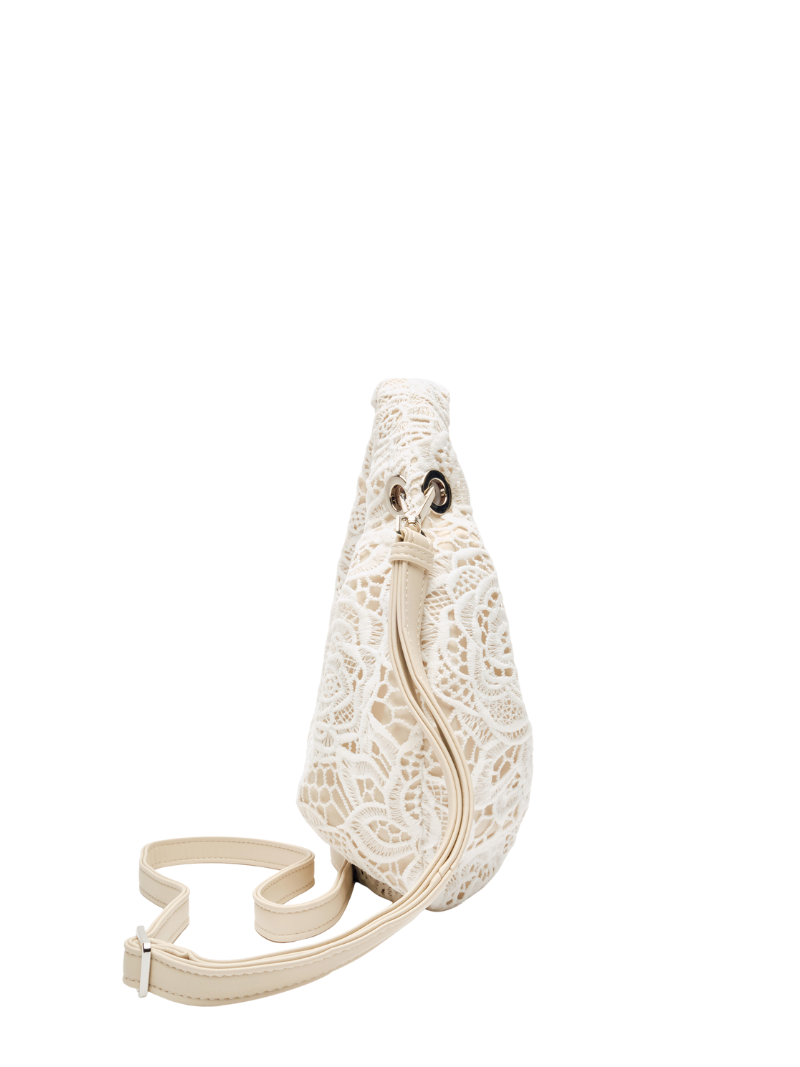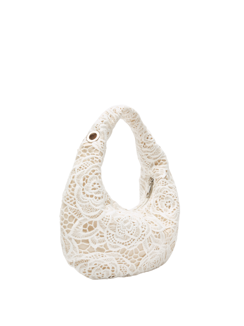 Bolso pequeño de encaje blanco con silueta curva y diseño romántico.