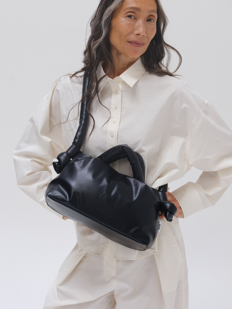 Fabricado en piel vegana suave de color negro, este bolso añade un toque de glamour a cualquier look, desde los más casual hasta los más sofisticados.