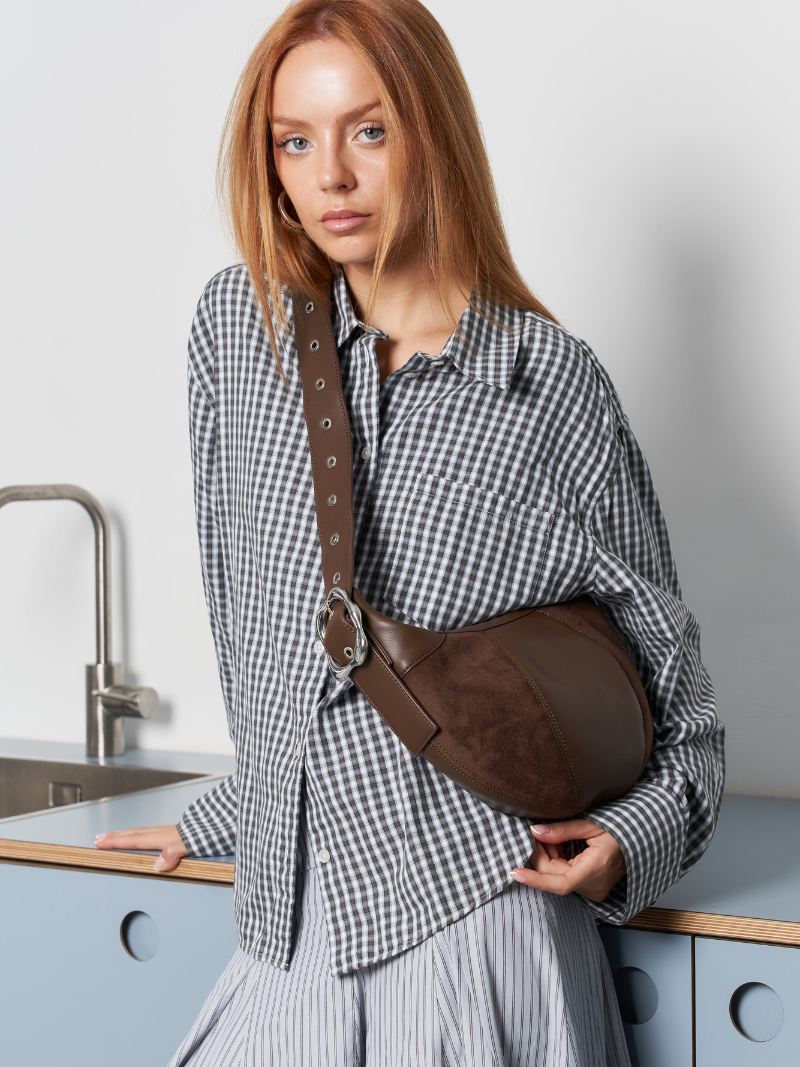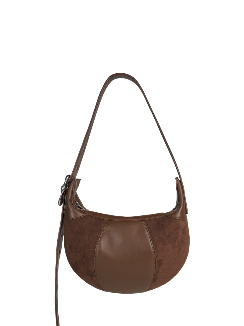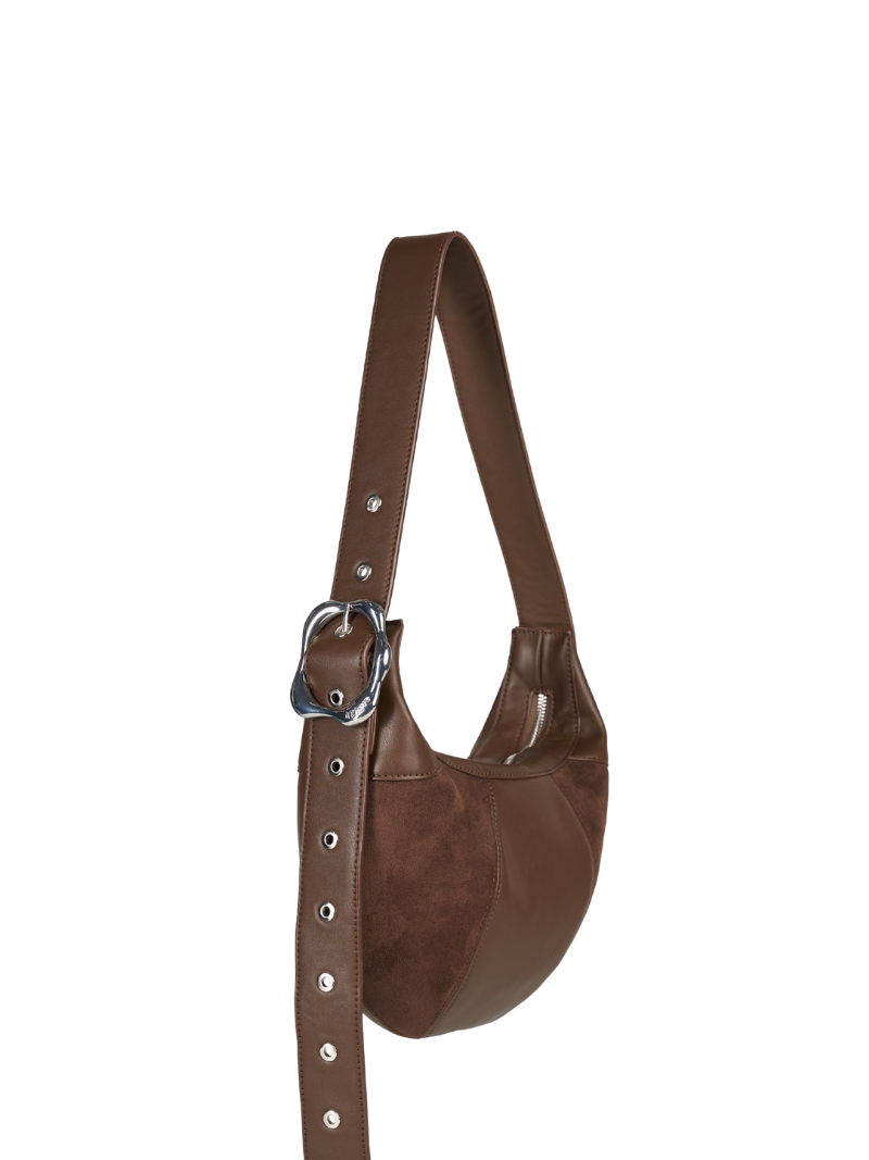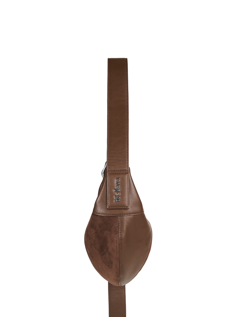 Bolso mediano de hombro o cruzado de forma ovalada. Confeccionado en napa vegana en color marrón brillante.