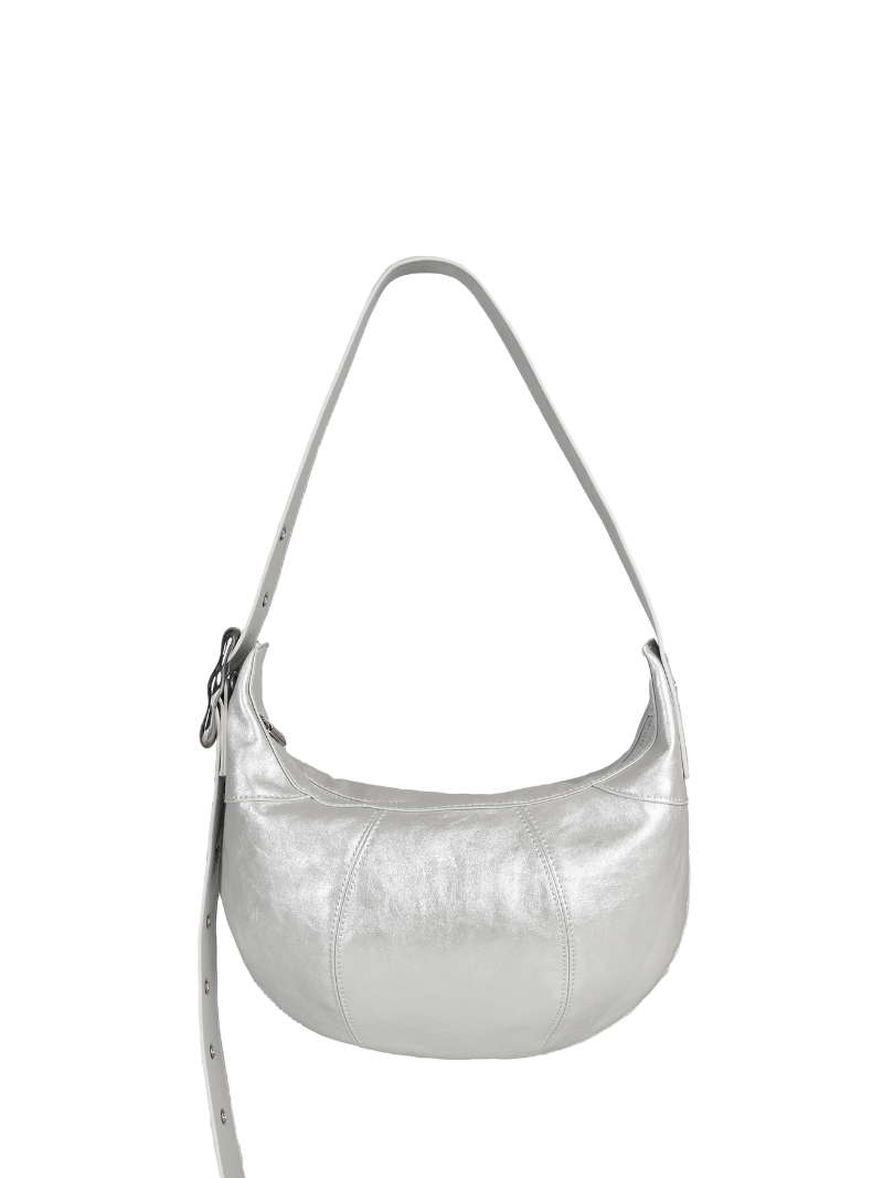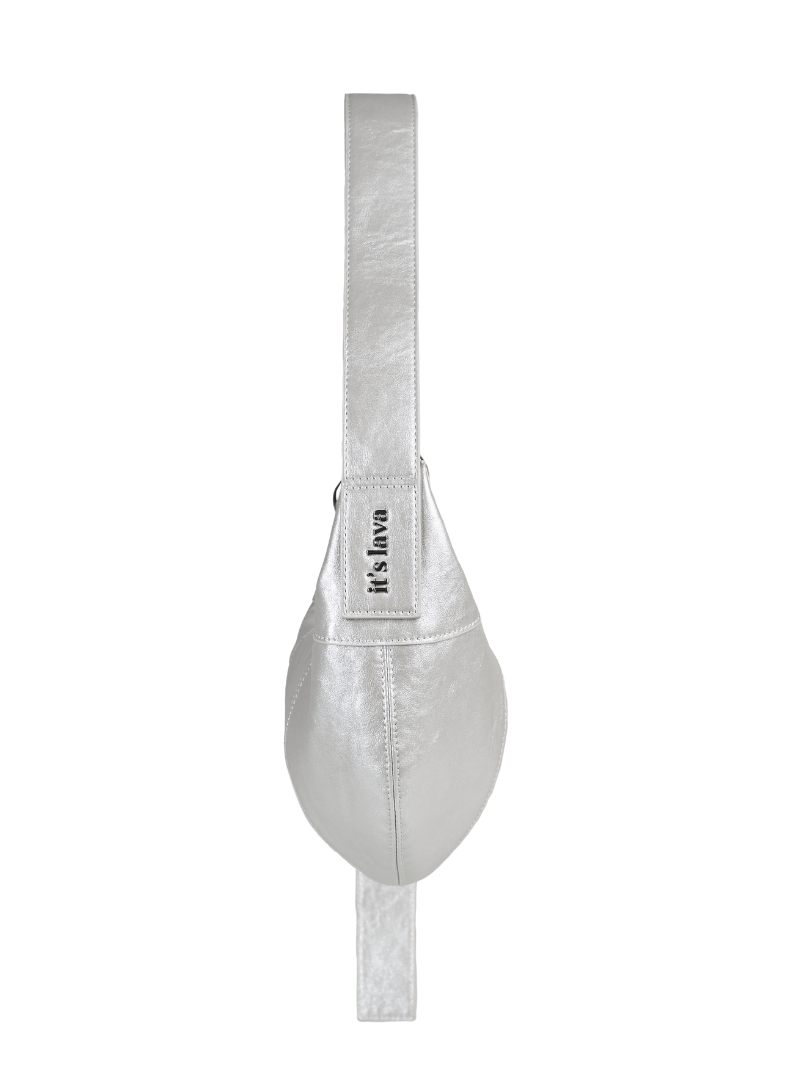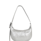 Bolso mediano de hombro o cruzado de forma ovalada. Confeccionado en napa vegana en color plateado.