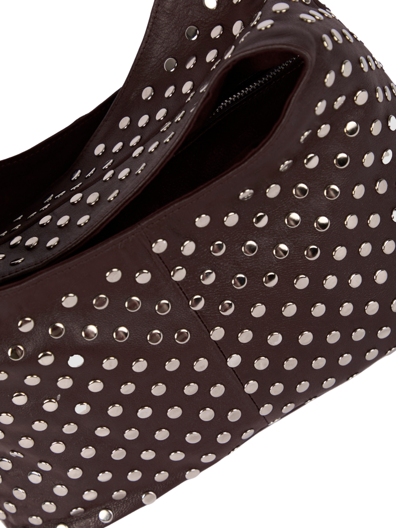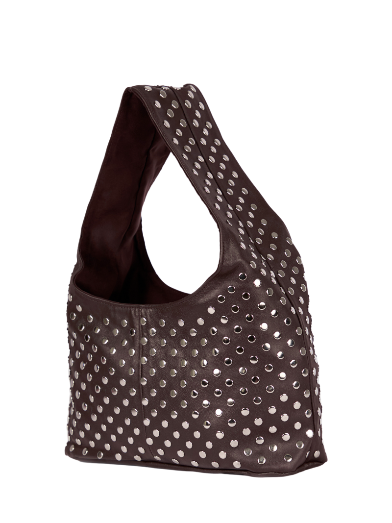 El Bolso de tachuelas Nimbin Marrón chocolate destaca por su elegante diseño y tachuelas plateadas que le aportan un toque moderno y sofisticado. Su talla única es ideal para llevar lo esencial, combinando estilo y funcionalidad. Encuentra este accesorio imprescindible en Ferent Bags y eleva tu look diario con un toque de distinción.