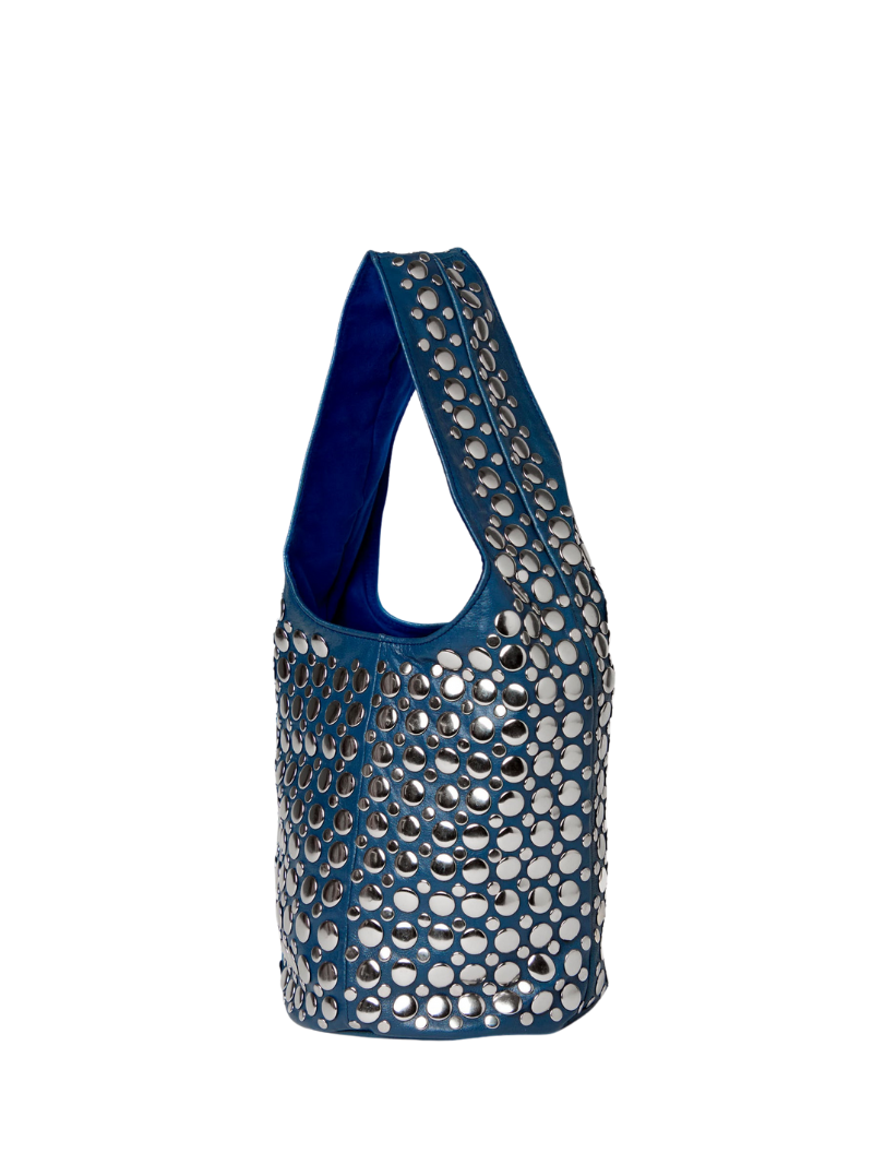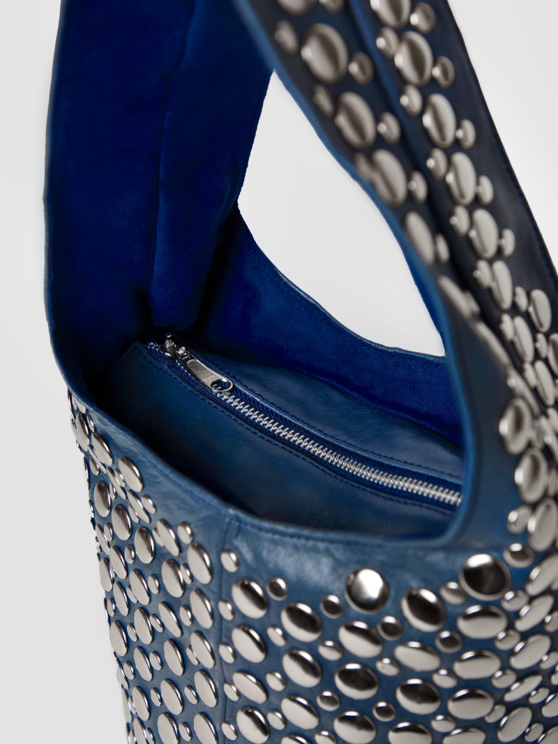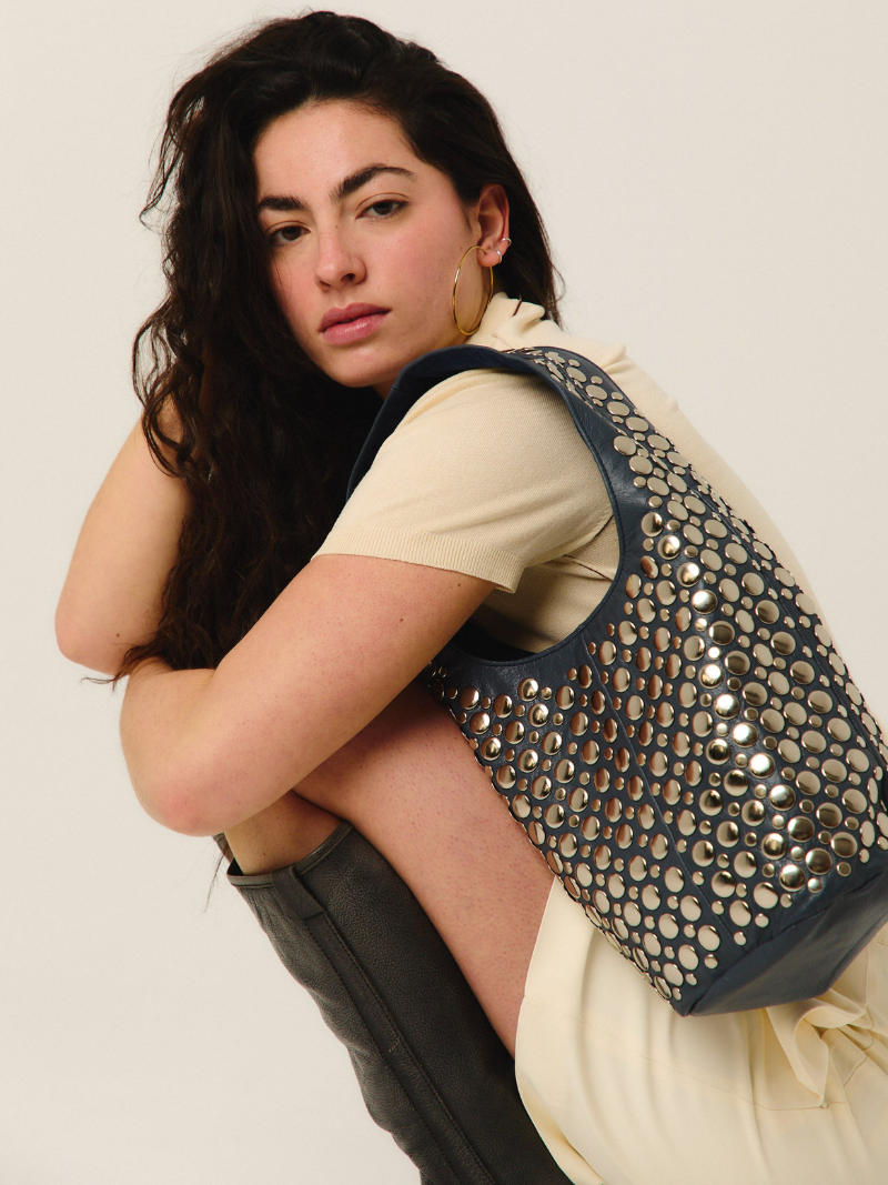 El bolso Noosa azul marino pequeño es el accesorio perfecto para quienes desean destacar con un estilo atrevido. Fabricado en piel de alta calidad, este bolso se complementa con detalles de tachuelas metálicas plateadas, creando un look edgy y sofisticado. Su tamaño compacto lo convierte en el aliado ideal para llevar lo esencial con estilo y elegancia. Este bolso es perfecto para añadir un toque audaz que eleva cualquier look, fusionando modernidad y personalidad en un solo accesorio.