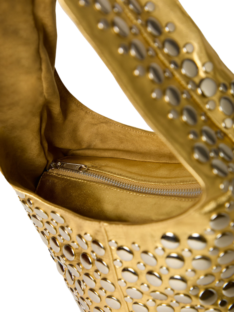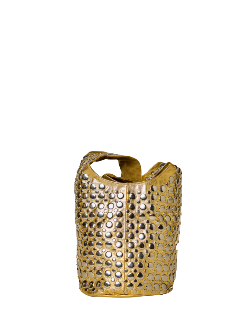 El bolso Noosa dorado pequeño es el accesorio perfecto para quienes desean destacar con un estilo atrevido. Fabricado en piel de alta calidad, su vibrante tono dorado se complementa con detalles de tachuelas metálicas plateadas, creando un look edgy y sofisticado. Su tamaño compacto lo convierte en el aliado ideal para llevar lo esencial con estilo y elegancia. Este bolso es perfecto para añadir un toque audaz que eleva cualquier look, fusionando modernidad y personalidad en un solo accesorio.
