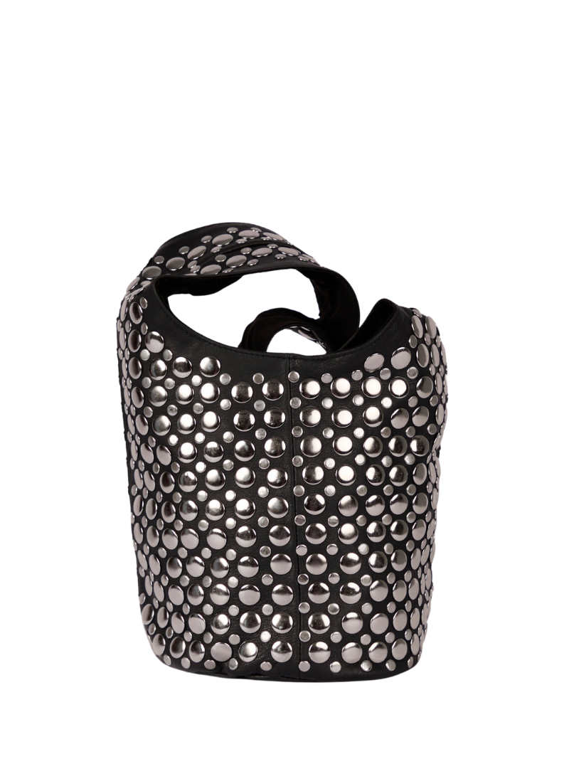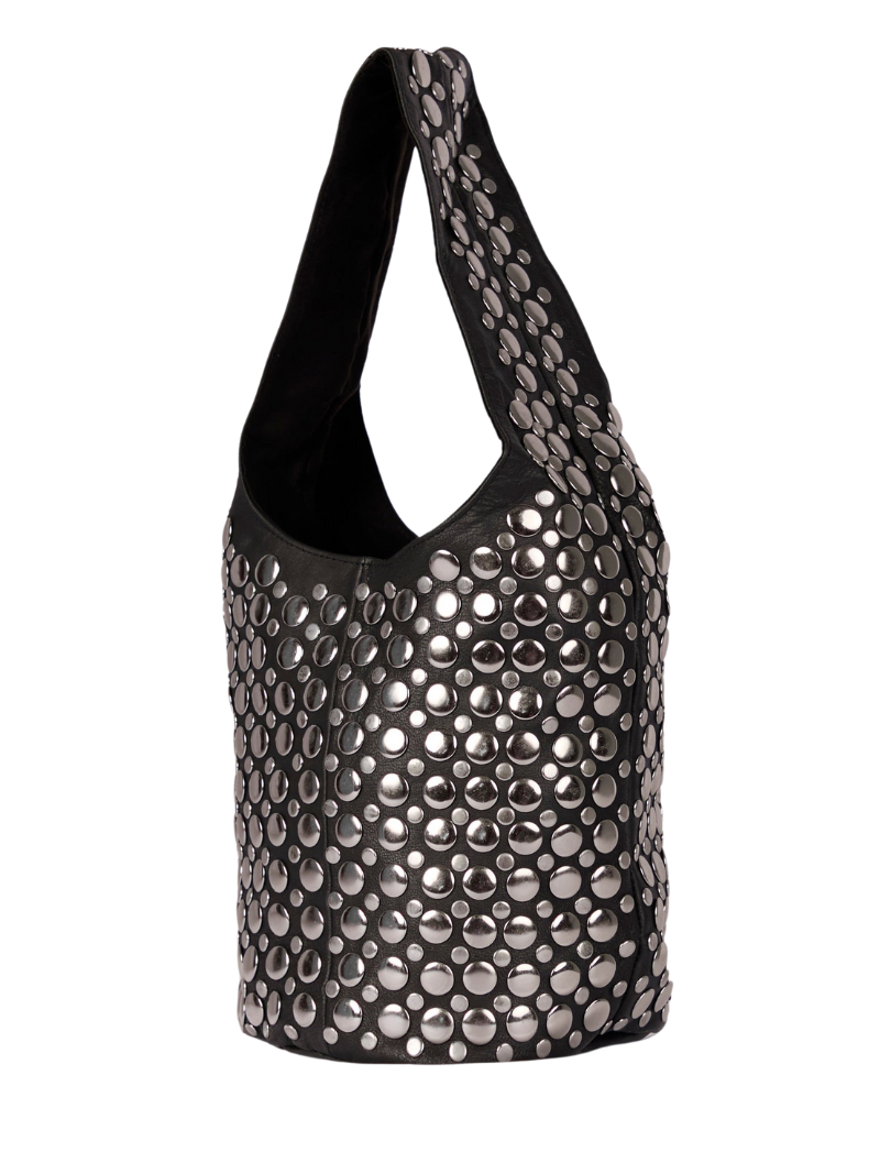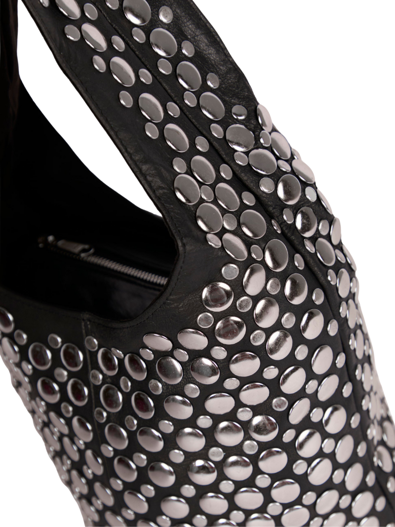 Bolso grande de tachuelas de piel de color negro. El accesorio perfecto para quienes buscan un toque audaz en su look. Fabricado en piel de alta calidad, su color marrón se realza con tachuelas metálicas plateadas, creando un look edgy y sofisticado. Su tamaño compacto lo convierte en el compañero ideal para llevar lo esencial con estilo y personalidad. Este bolso es perfecto para quienes desean añadir un toque moderno que eleve cualquier outfit y resalte su sentido de la moda.