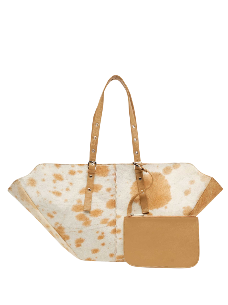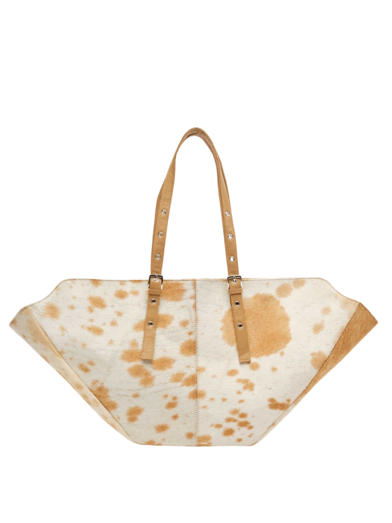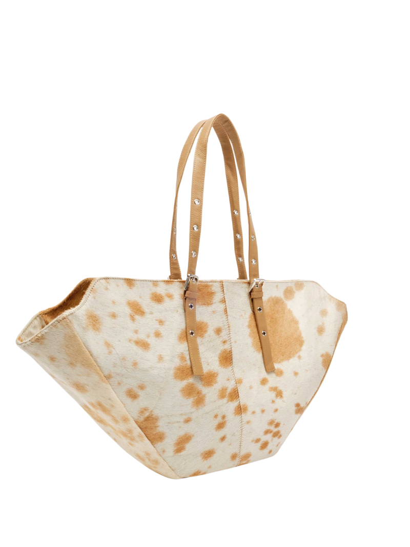 El Nora Shopper Light Brown Dots es el bolso perfecto para el día a día gracias a su gran capacidad y diseño único. Su estampado de vaca en tonos blanco y marrón lo hace especial, ya que no hay dos iguales.