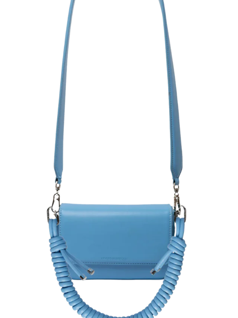 Bolso cruzado o de hombro pequeño de piel vegana en color azul cielo. Destaca por su diseño rígido y su cierre de solapa con dos imanes.
