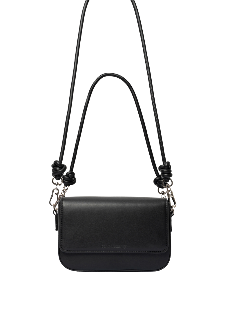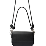 Bolso de hombro pequeño de piel vegana en color negro. Destaca por su diseño y su cierre de solapa con dos imanes.