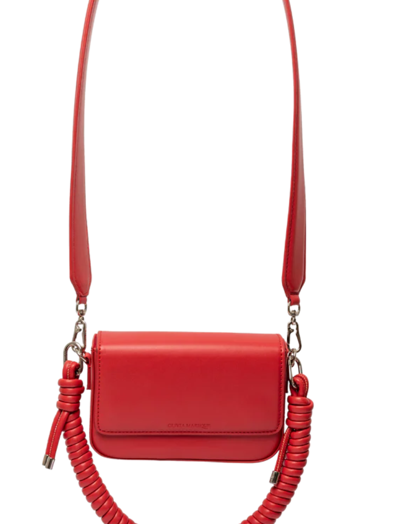 Bolso cruzado o de hombro pequeño de piel vegana en color rojo. Destaca por su diseño rígido y su cierre de solapa con dos imanes.