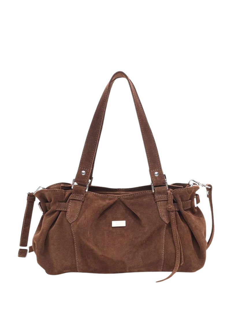 Bolso de hombro amplio en ante suave de chocolate, con un diseño drapeado elegante que lo convierte en el protagonista del look. Cuenta con un compartimento principal grande con cremallera y varios bolsillos interiores para llevarlo todo organizado.