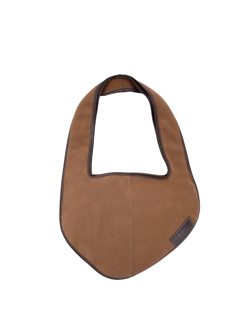 Bolso de hombro ovalado que mezcla serraje camel con bordes en piel marrón chocolate, un contraste lleno de carácter y personalidad. Con asa fija y logo grabado en el frontal.