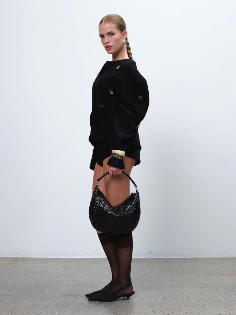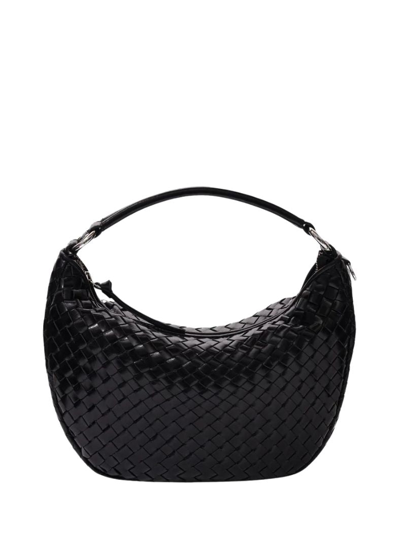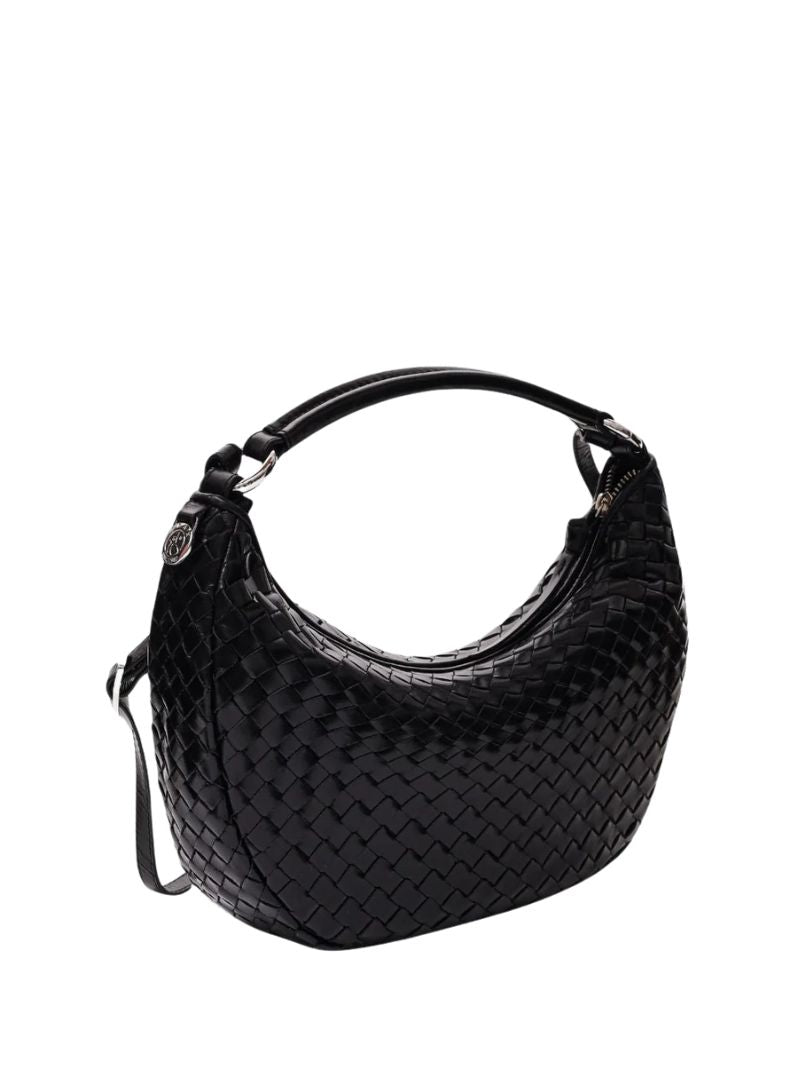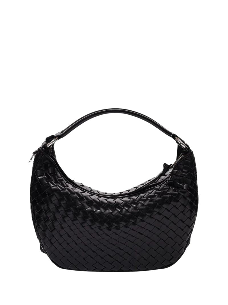 Bolso de hombro con diseño tejido en piel negra. Incluye dos correas desmontables: una corta para llevar al hombro o en la mano, y una correa larga ajustable para llevarlo cruzado.