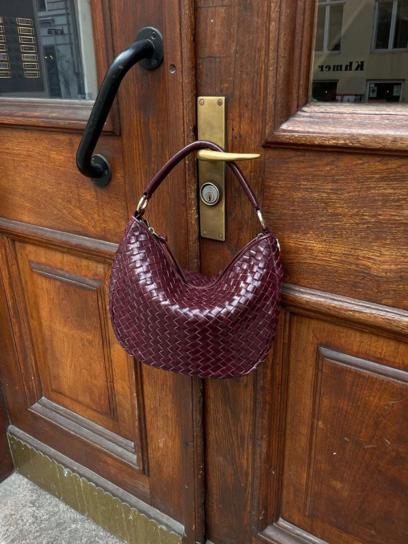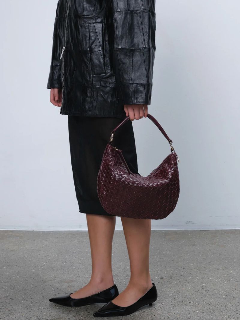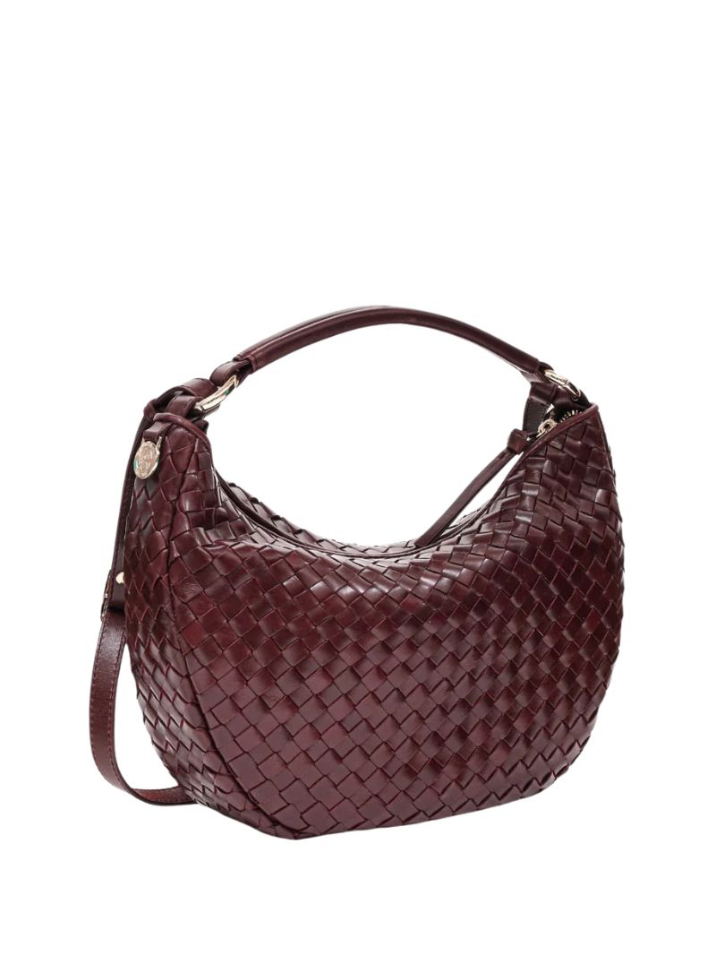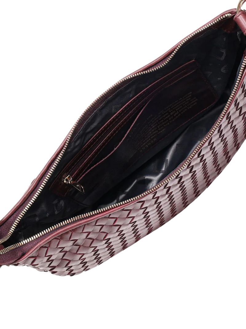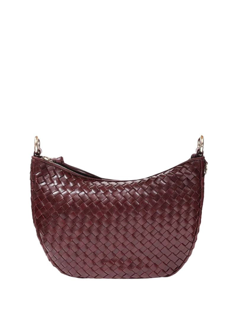 Bolso de hombro con diseño tejido en piel color vino. Incluye dos correas desmontables: una corta para llevar al hombro o en la mano, y una correa larga ajustable para llevarlo cruzado.