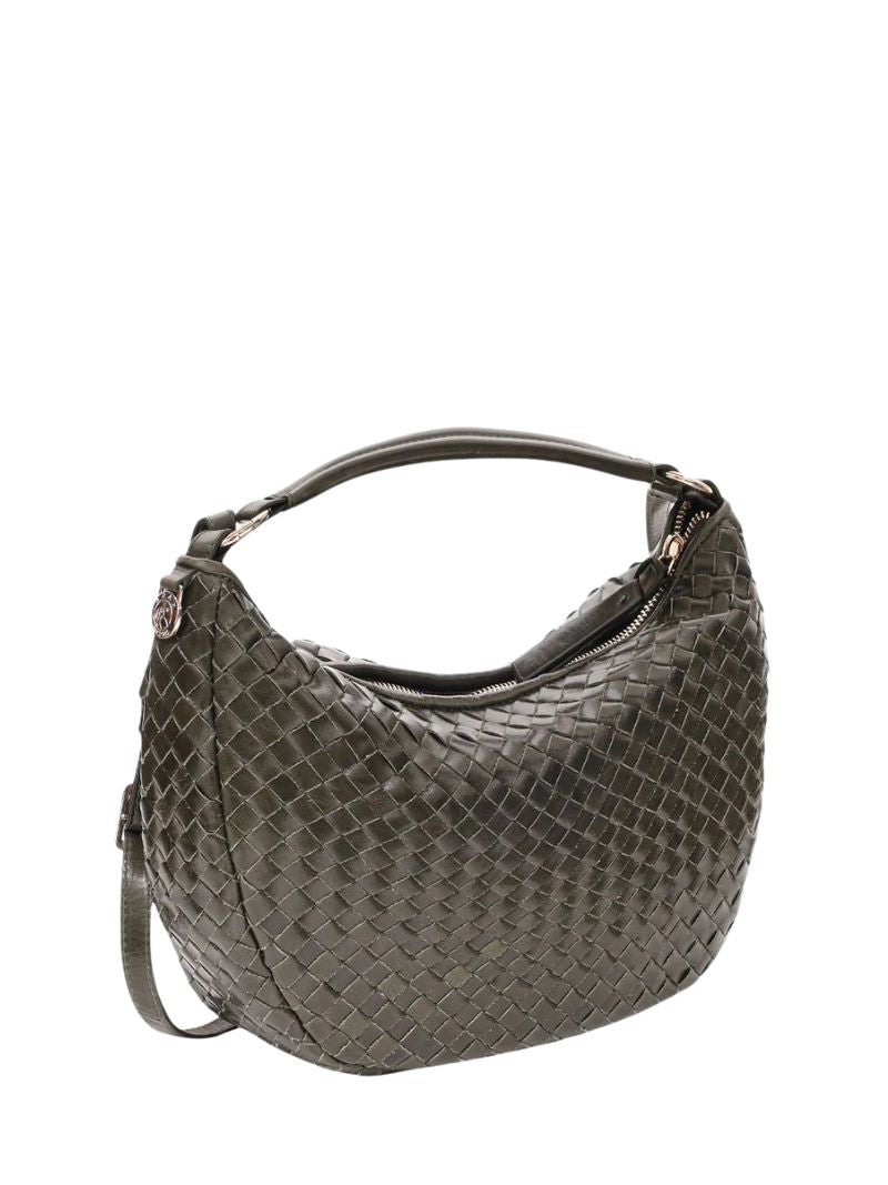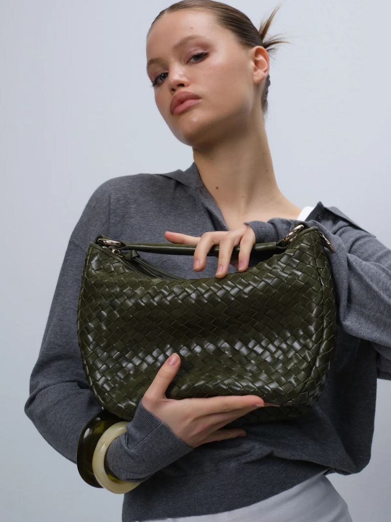 Bolso de hombro con diseño tejido en piel verde oliva. Incluye dos correas desmontables: una corta para llevar al hombro o en la mano, y una correa larga ajustable para llevarlo cruzado.