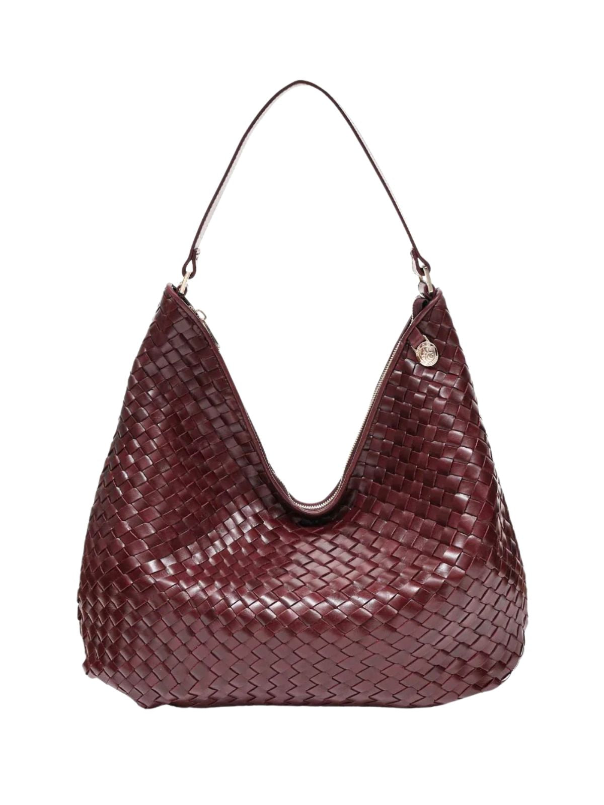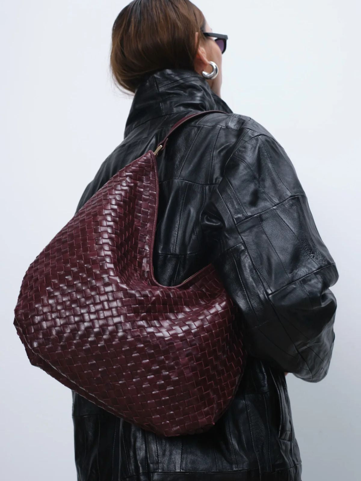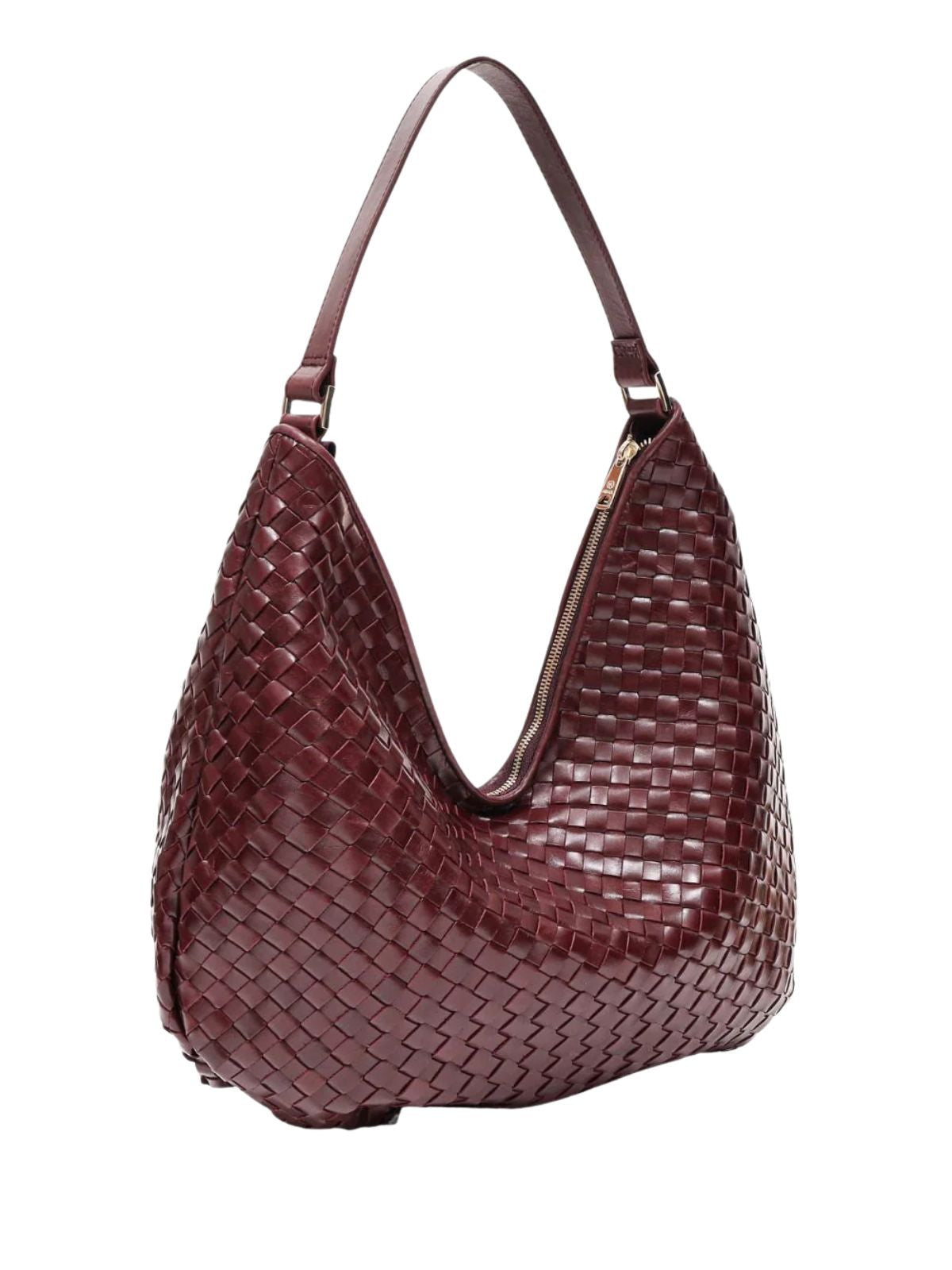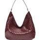 Bolso grande de hombro en piel trenzada en color vino, amplio y cómodo para el día a día. Su diseño suave se adapta al cuerpo y permite llevarlo fácilmente al hombro.