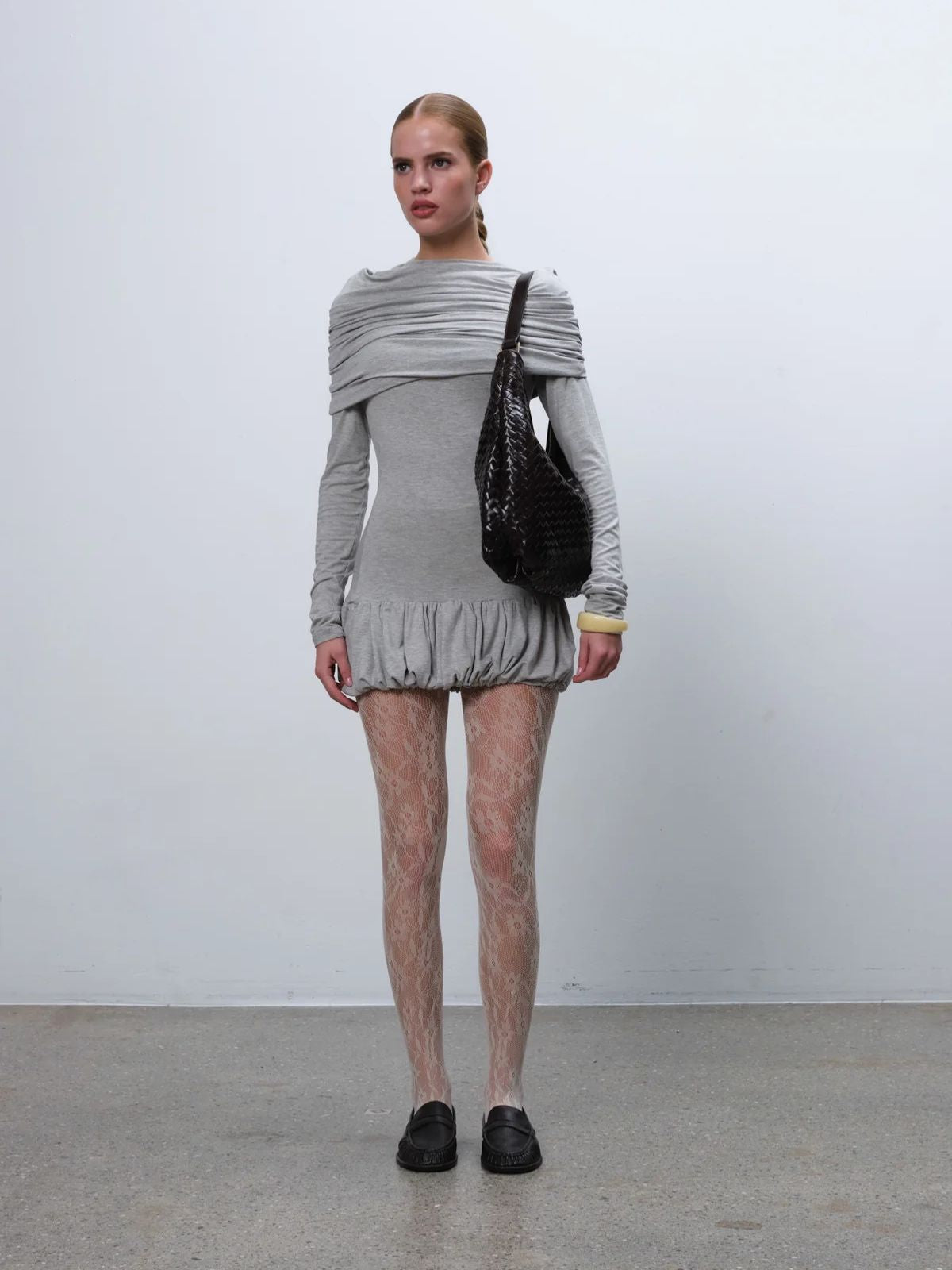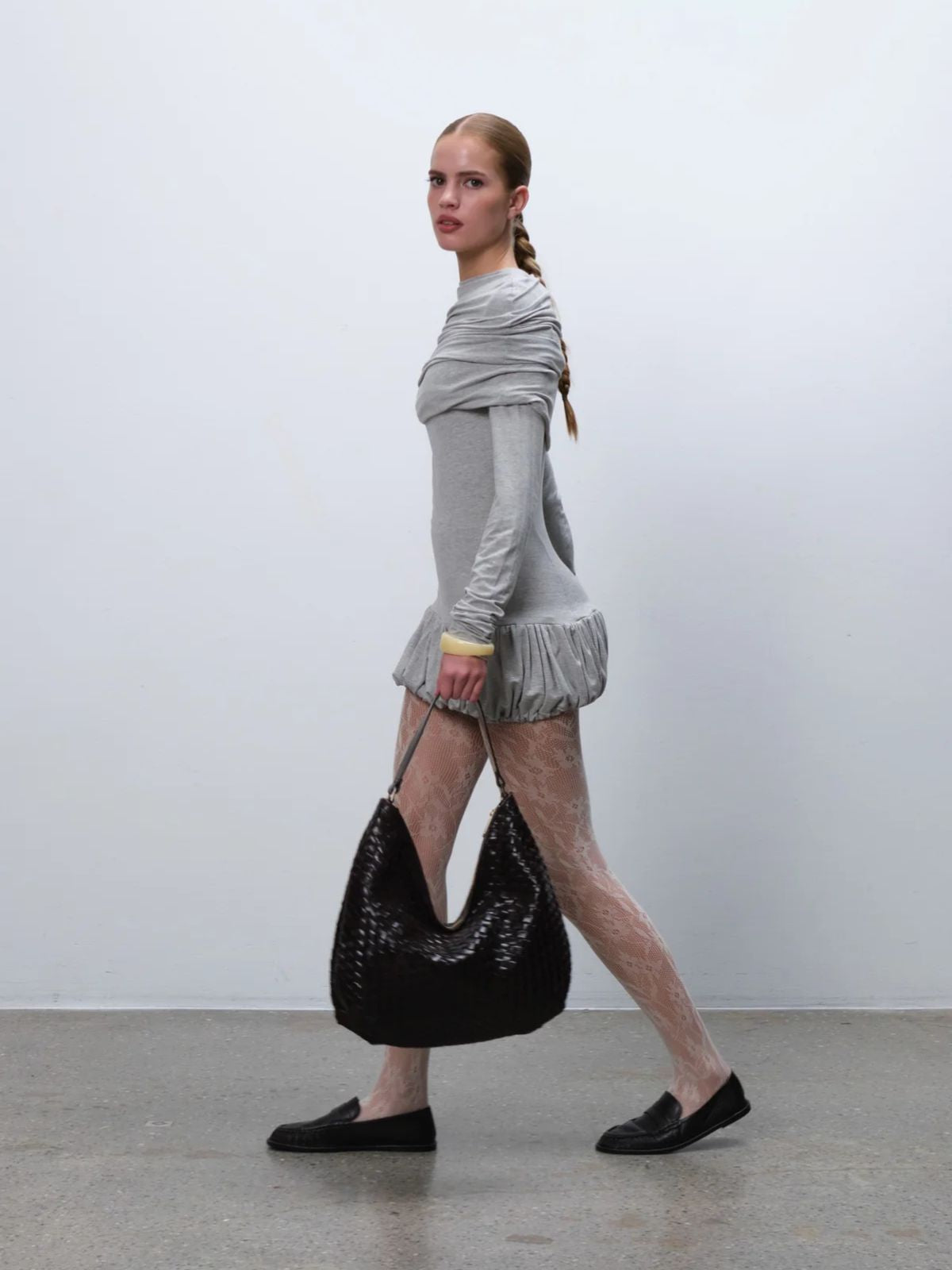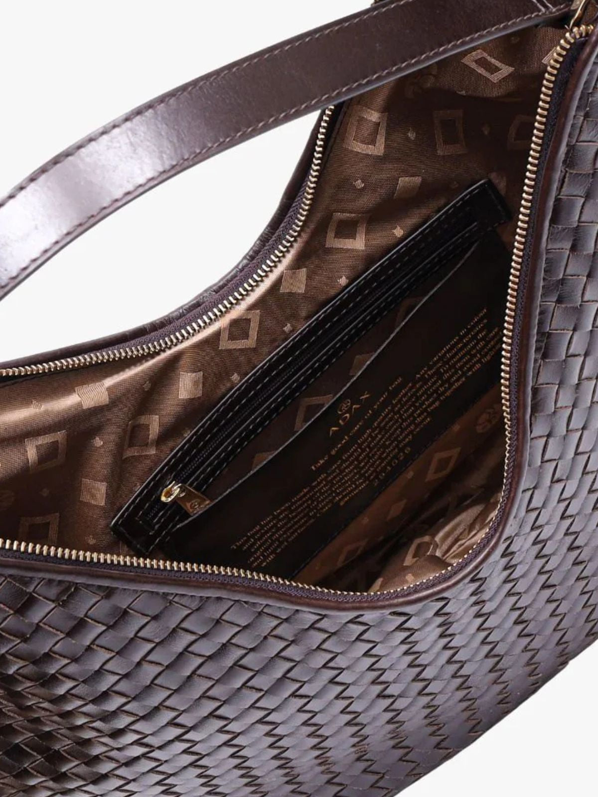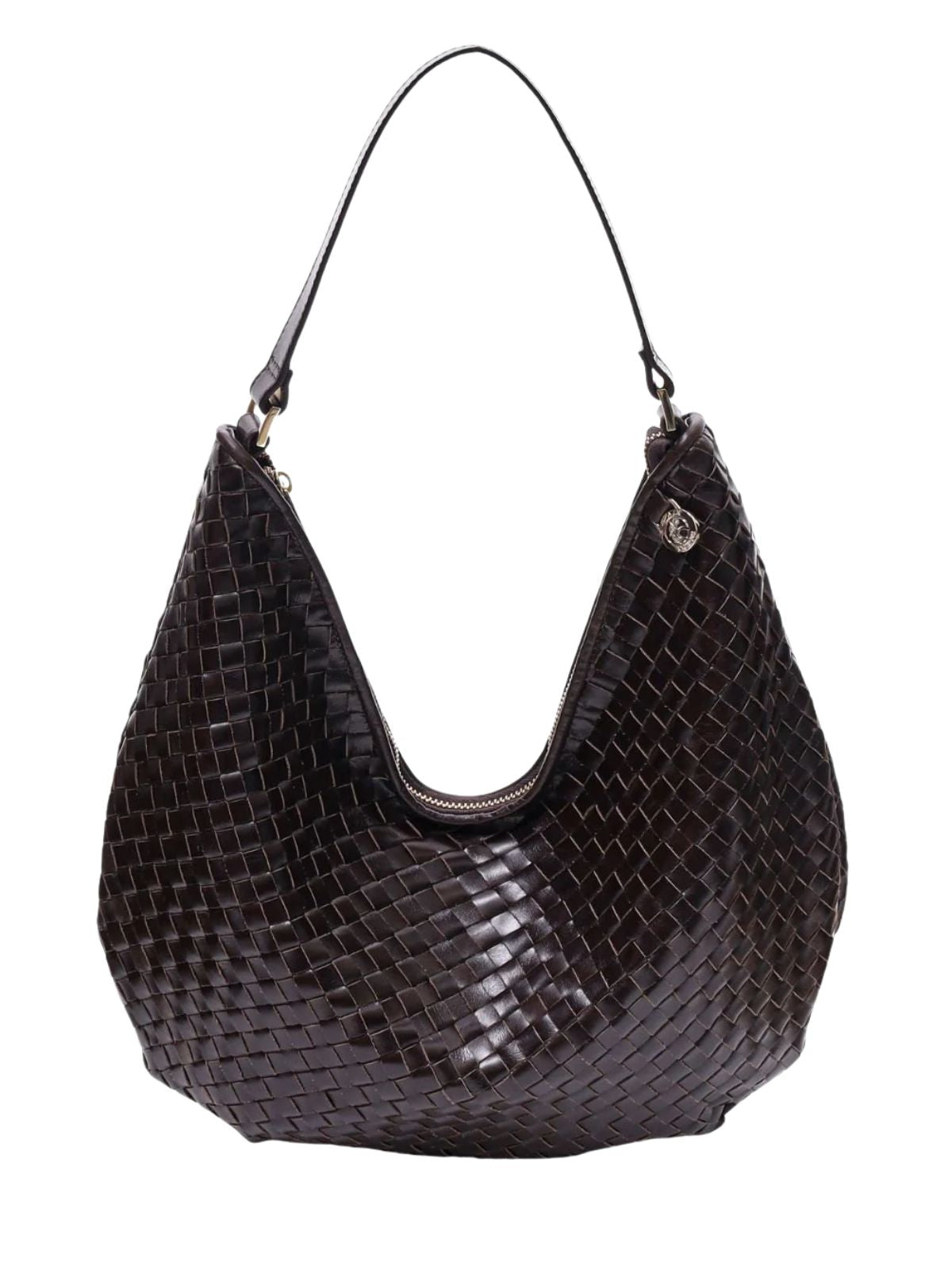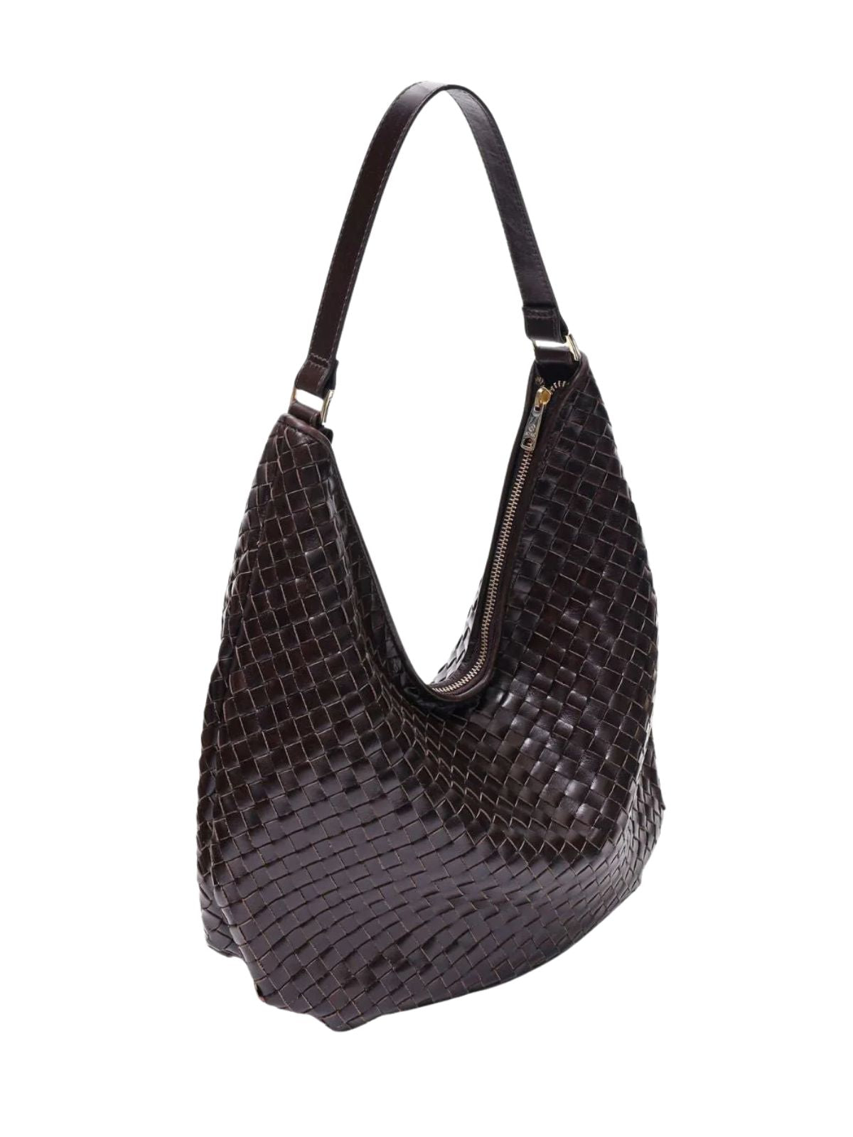 Bolso grande de hombro en piel trenzada en color marrón oscuro, amplio y cómodo para el día a día. Su diseño suave se adapta al cuerpo y permite llevarlo fácilmente al hombro.