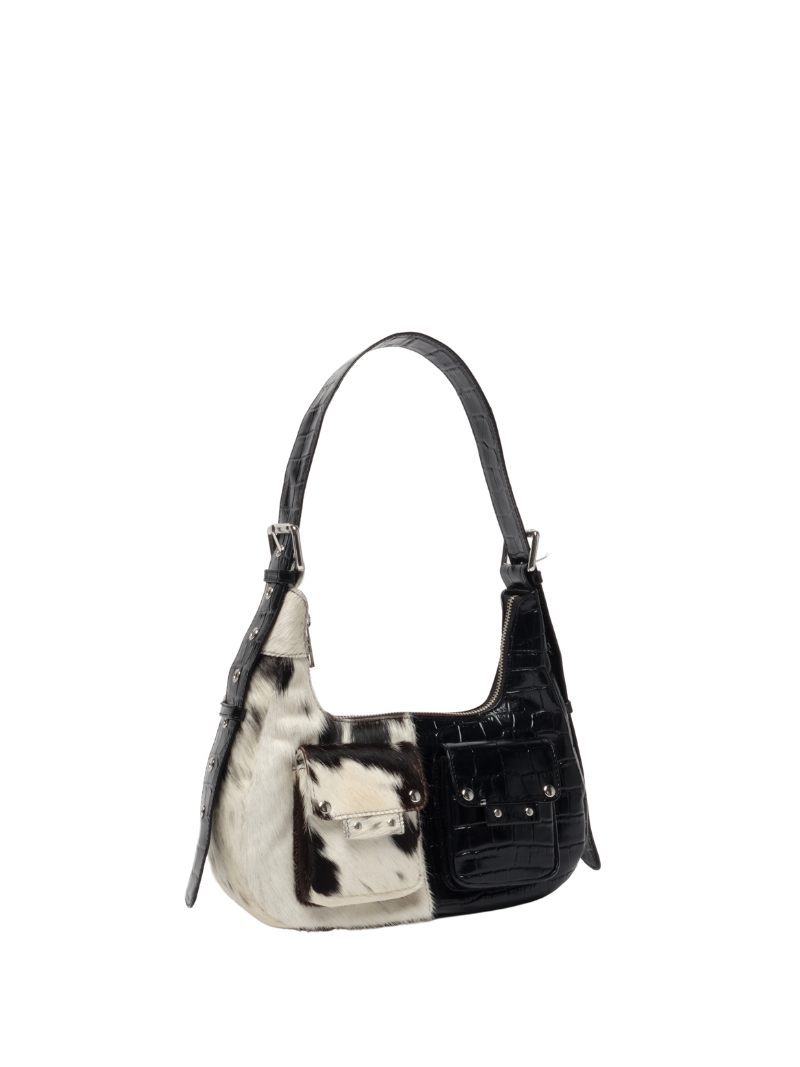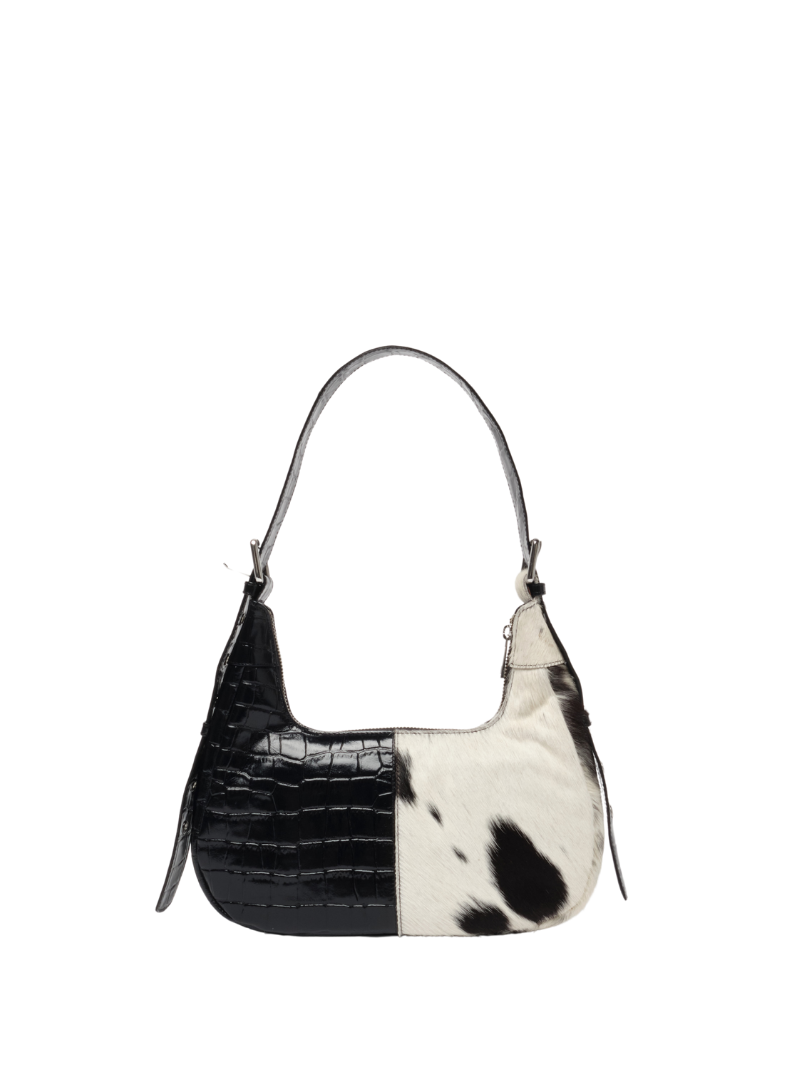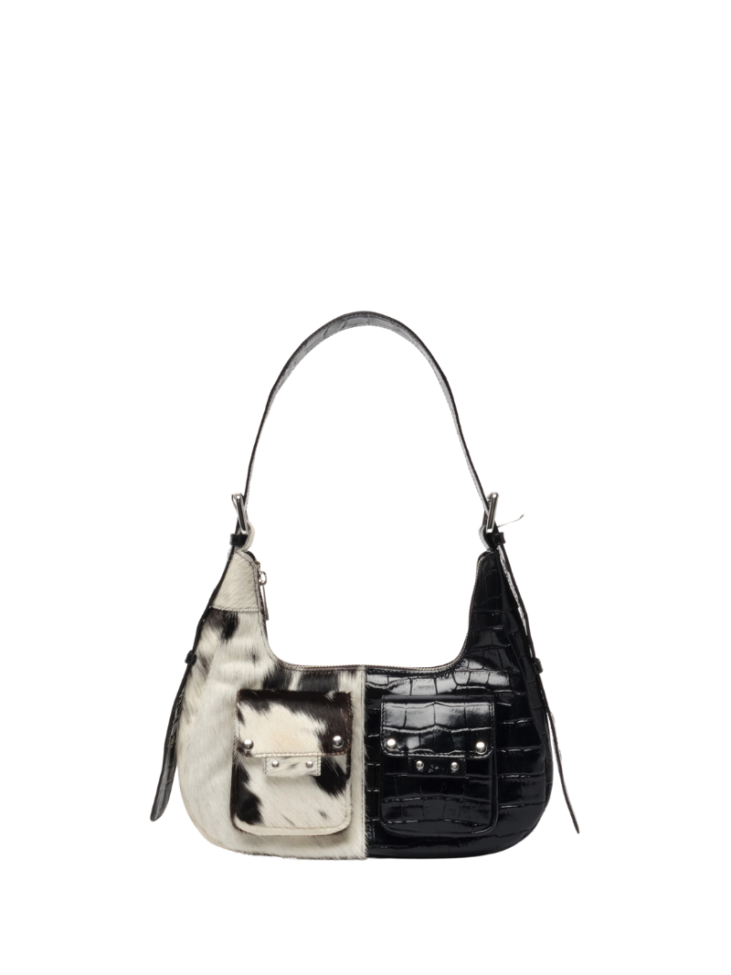 Bolso de hombro con diseño estructurado y forma ligeramente curva. Presenta un diseño bicolor dividido verticalmente: un lado está confeccionado en piel con efecto cocodrilo en color negro, mientras que el otro combina pelo con estampado de vaca en blanco y negro.