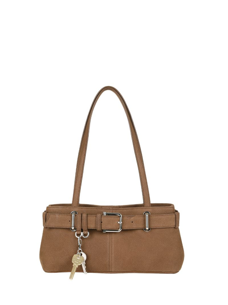 Bolso de hombro en piel de color marrón, con un cinturón ajustable y hebilla metálica que le da un toque moderno. Su diseño espacioso y asas largas garantizan comodidad y estilo.