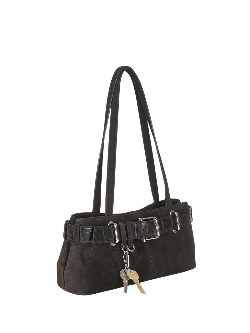 Bolso de hombro en ante de color marrón oscuro, con un cinturón ajustable y hebilla metálica que le da un toque moderno. Su diseño espacioso y asas largas garantizan comodidad y estilo.