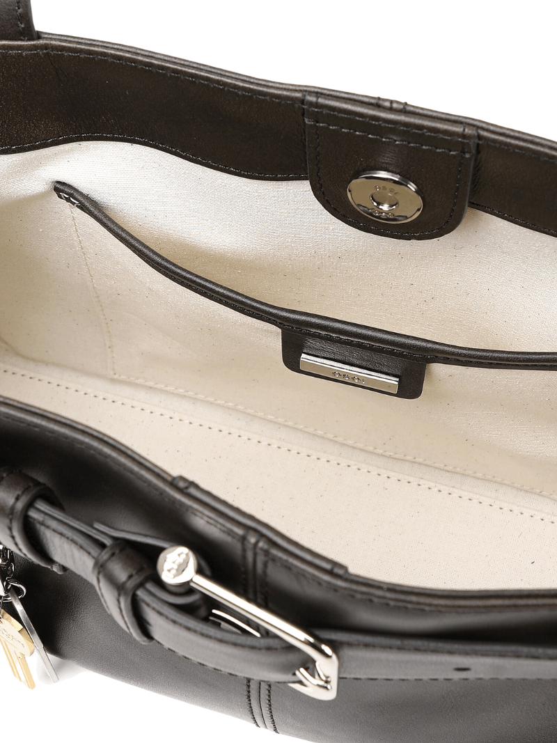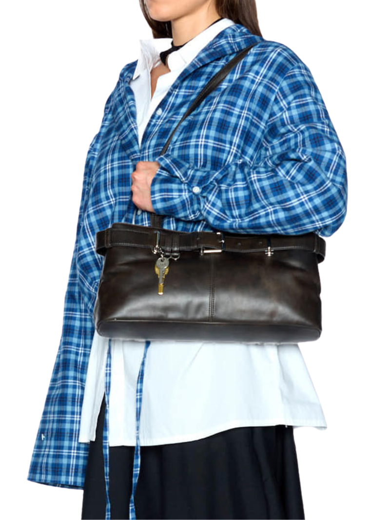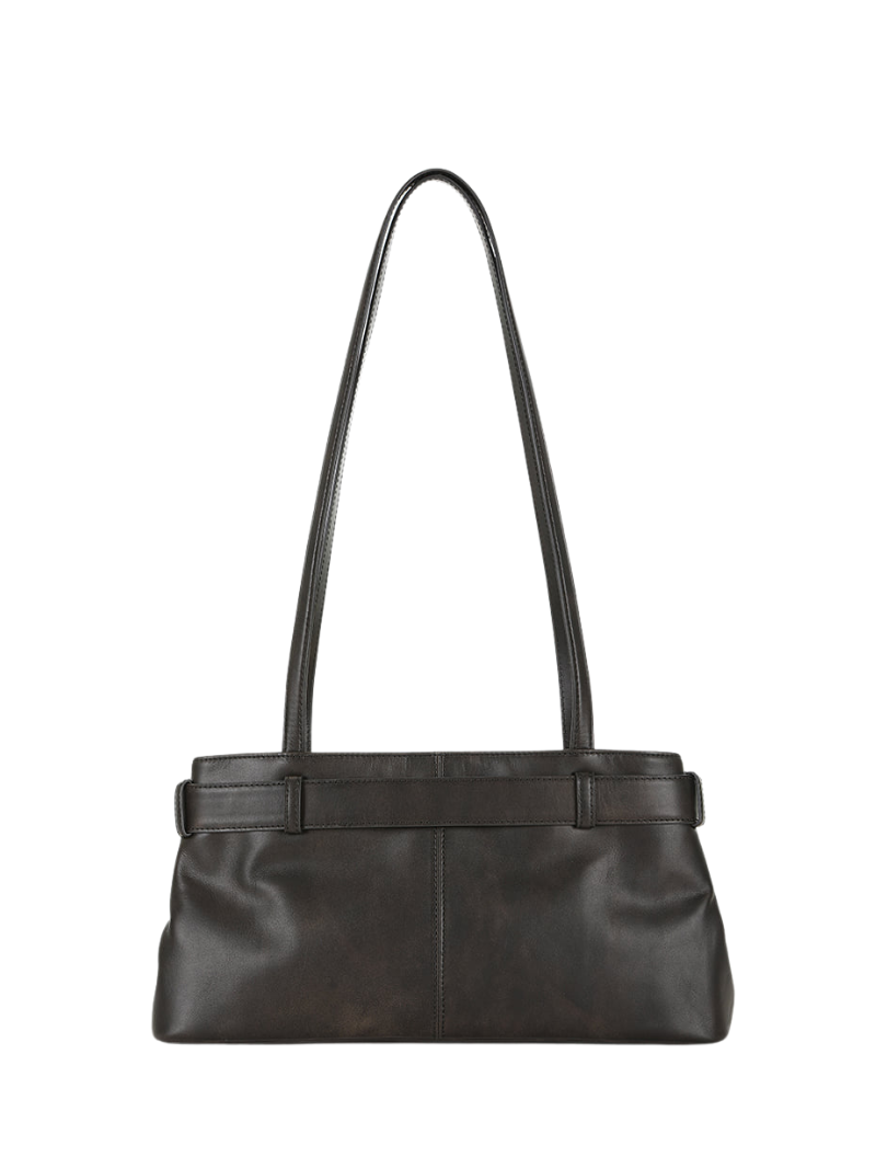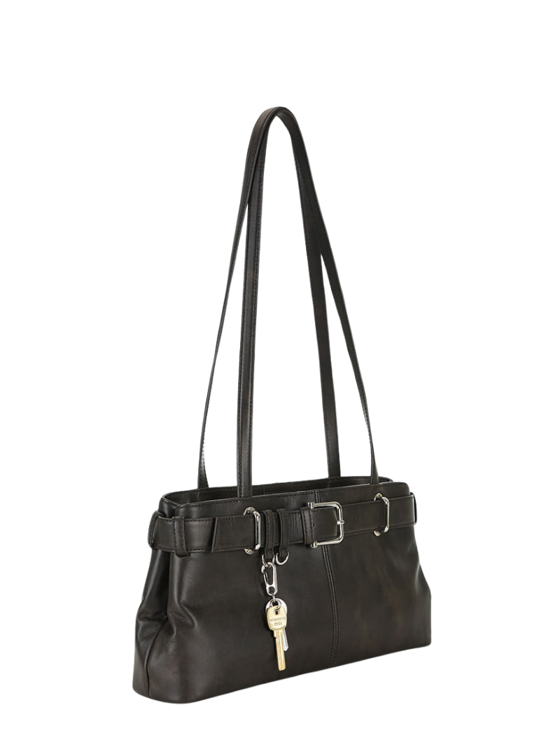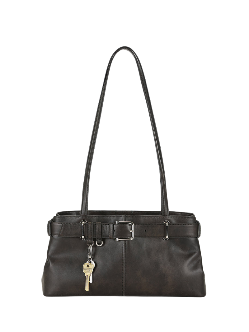 UNIDADES LIMITADAS. BOLSO MUY SOLICITADO. Bolso de hombro en piel marrón con un detalle distintivo de cinturón ajustable y hebilla metálica. Su estructura espaciosa y asas largas ofrecen comodidad y estilo para el día a día.