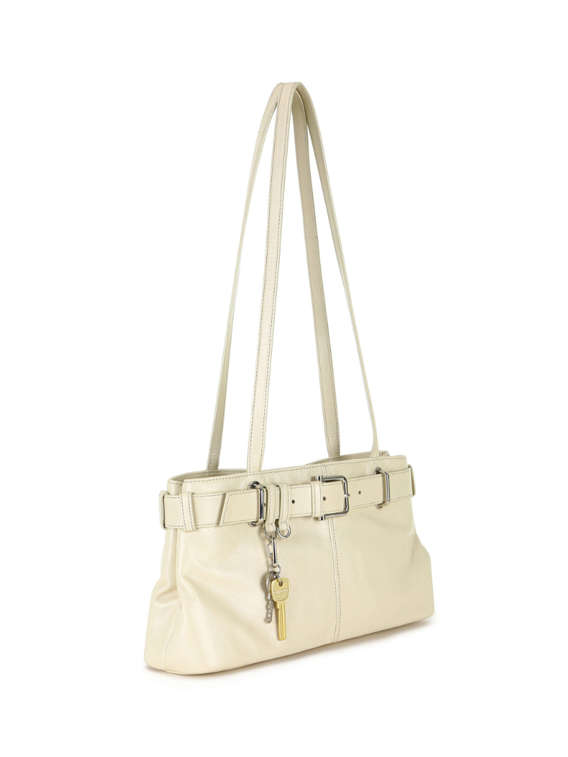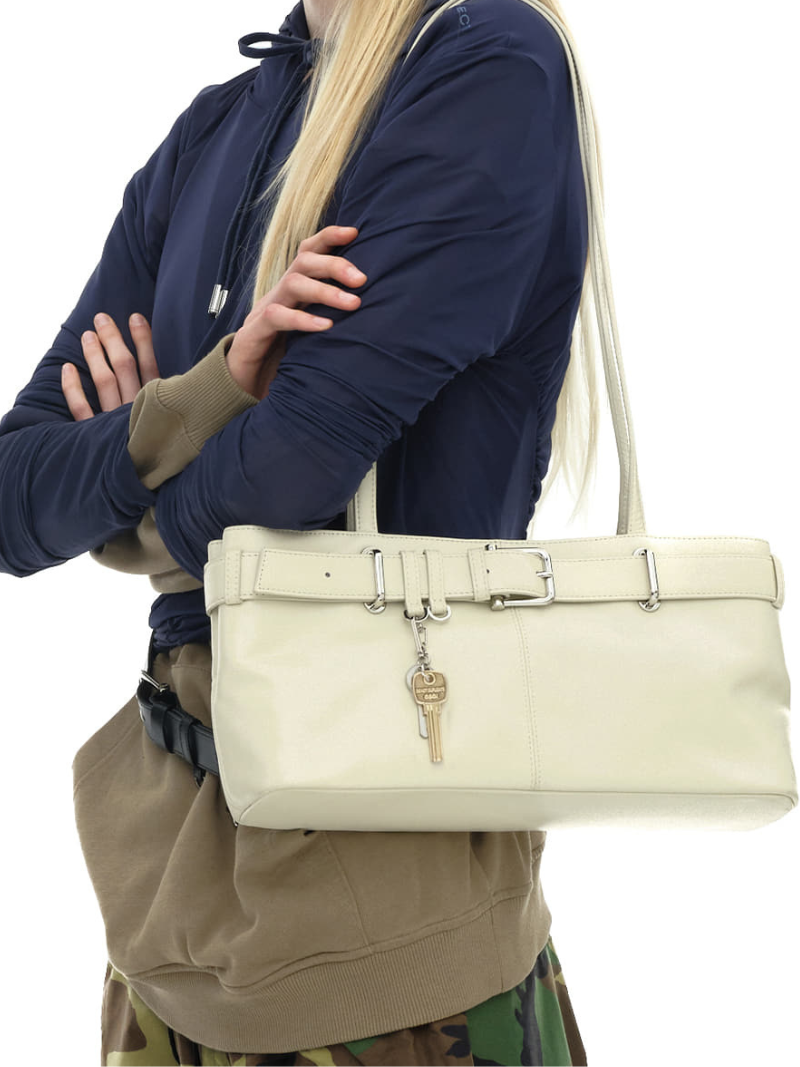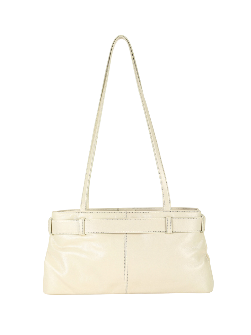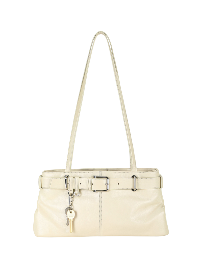 UNIDADES LIMITADAS. BOLSO MUY SOLICITADO. El bolso Shoulder Brocle Stone Cream de OSOI es un bolso de hombro en piel color crema con un detalle distintivo de cinturón ajustable y hebilla metálica. Su estructura espaciosa y asas largas ofrecen comodidad y estilo para el día a día.