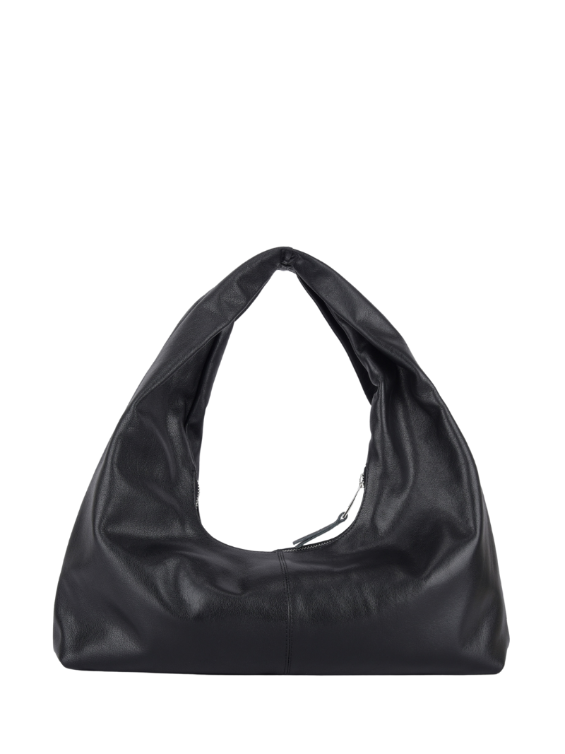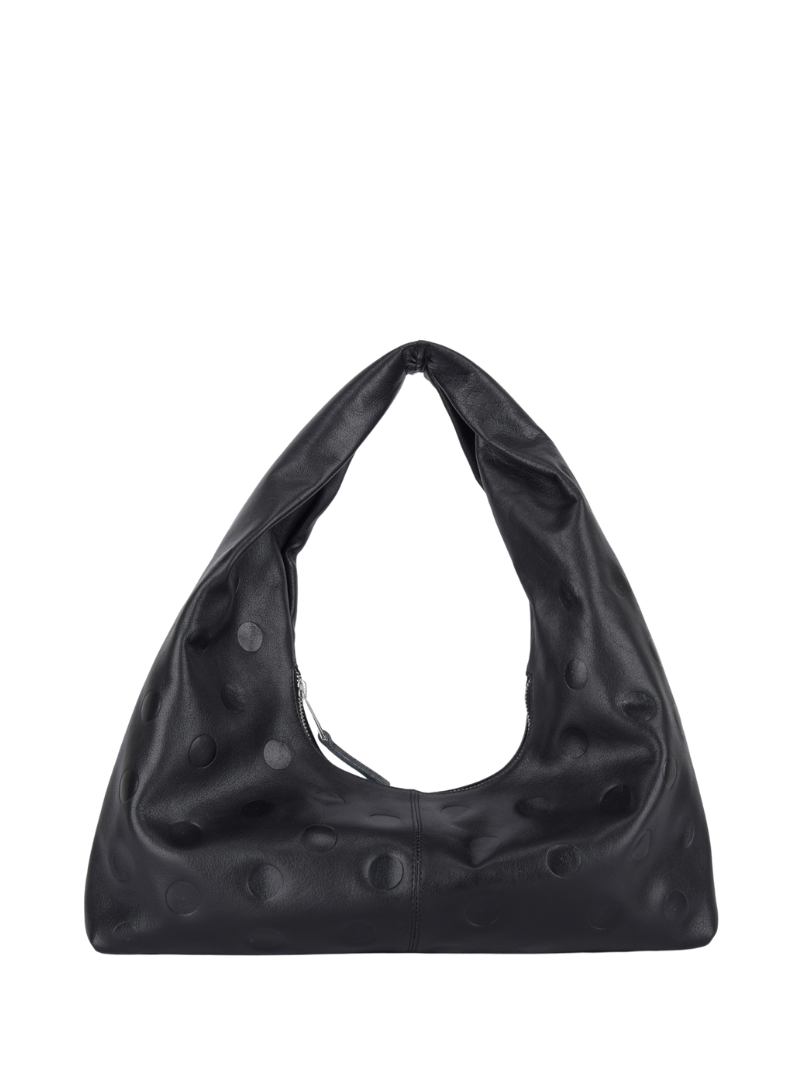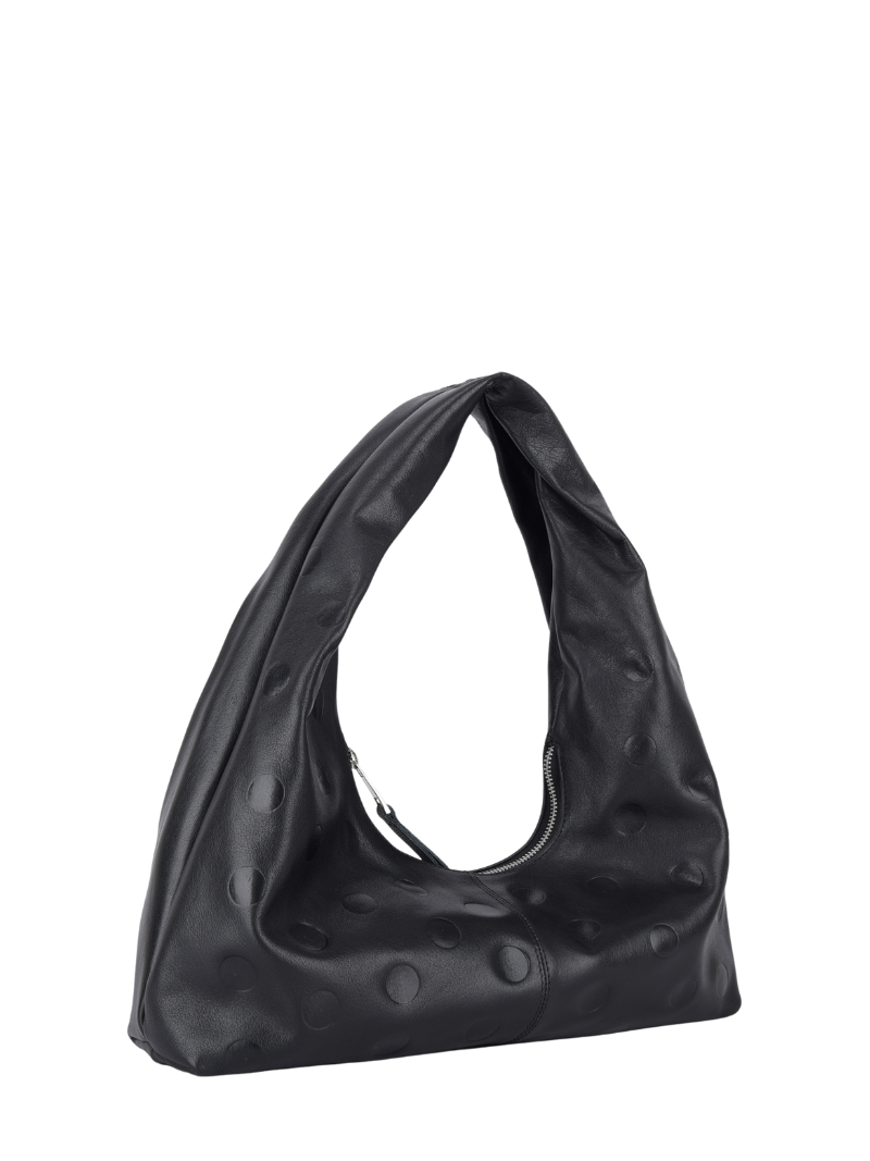 Bolso pequeño en color negro de piel con efecto topos, un diseño icónico que combina estilo y comodidad.