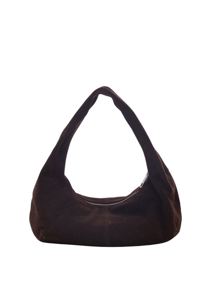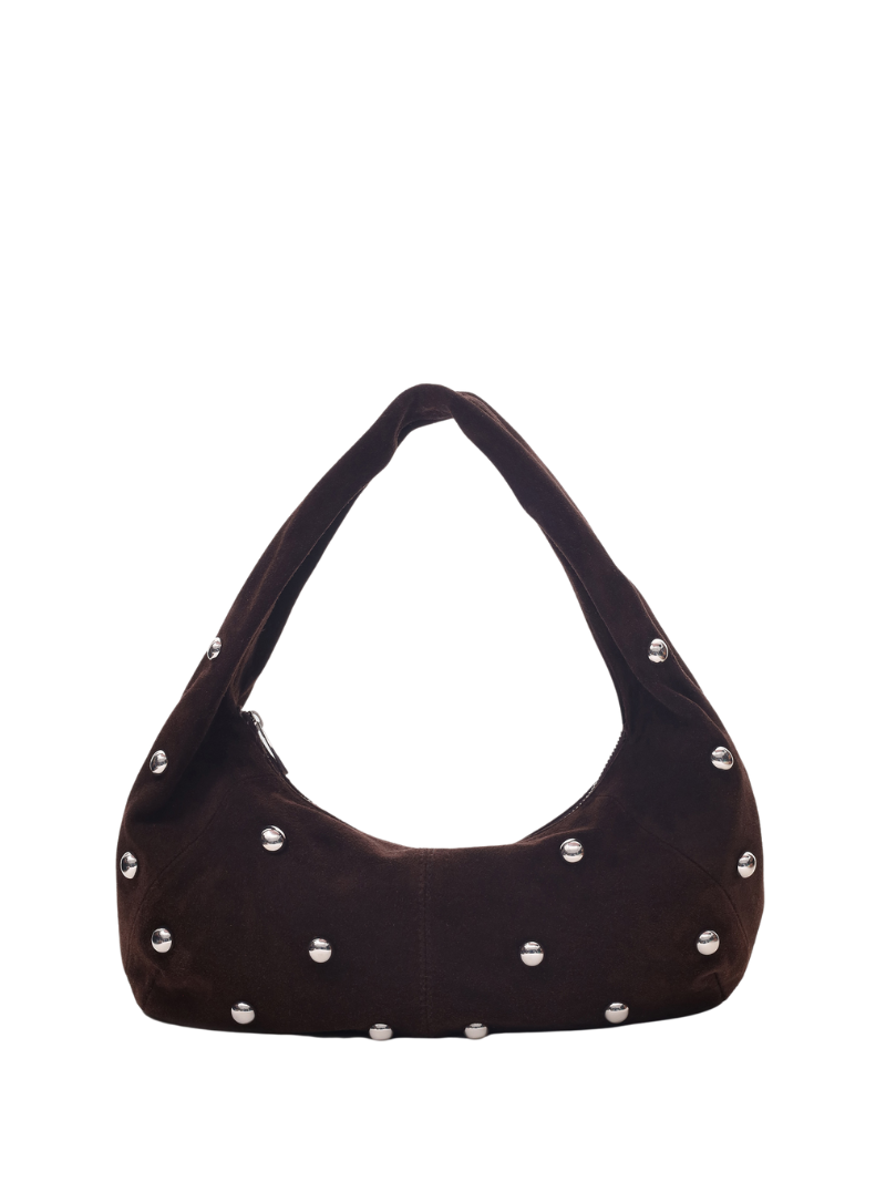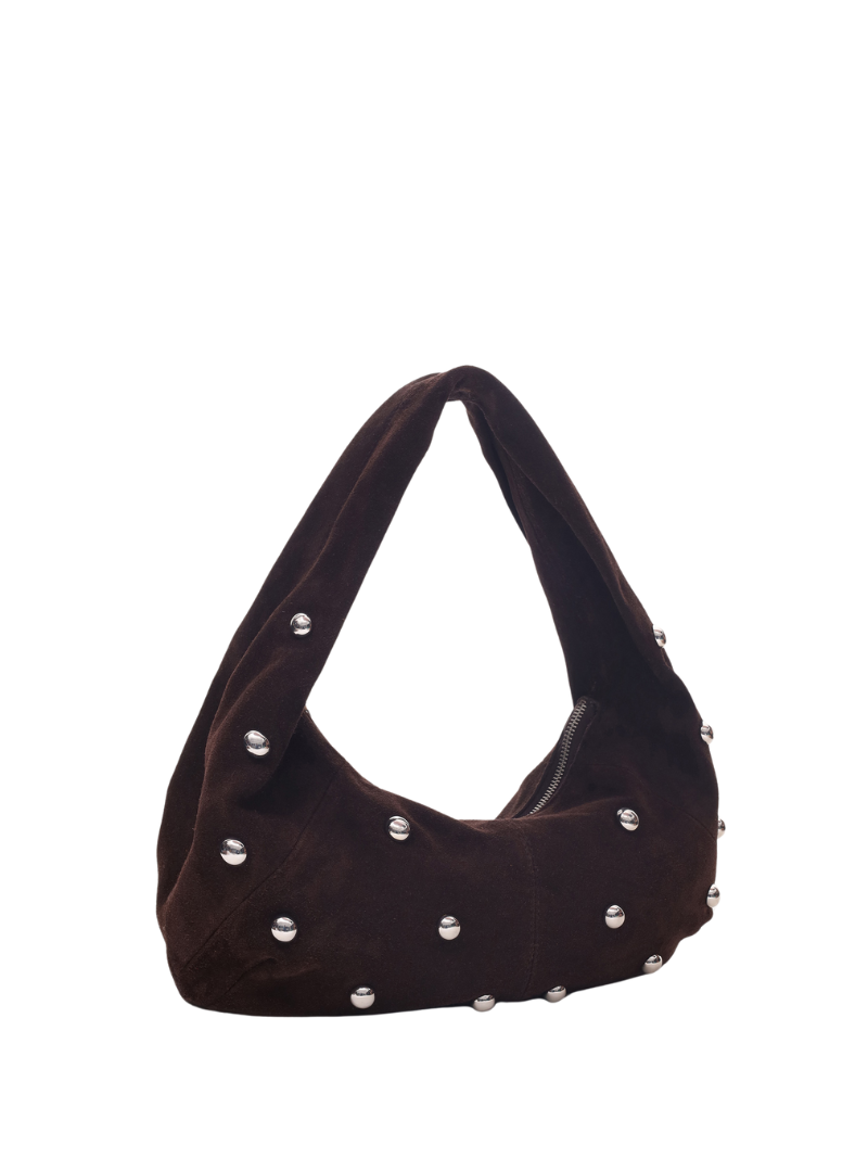 Bolso de piel de ante en color marrón chocolate con tachuelas. El aliado perfecto para quienes buscan estilo y practicidad. Su tamaño mediano lo convierte en la opción ideal para llevar todos tus imprescindibles: móvil, cartera, gafas de sol, gafas de ver, un paraguas compacto y hasta una botella de agua pequeña.