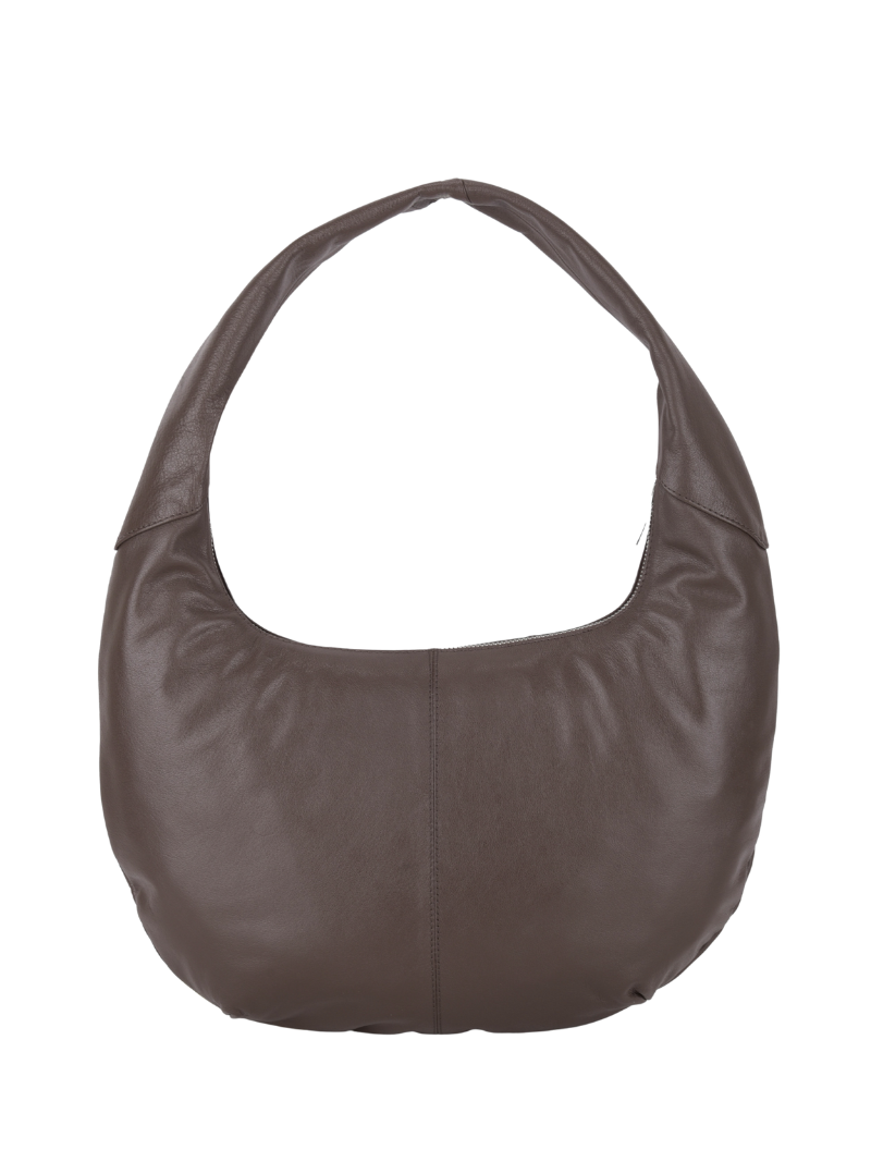 Bolso de hombro de piel en color marrón con detalle de tachuelas plateadas. Su silueta curvada y moderna lo convierte en un accesorio versátil, ideal tanto para el uso diario como para ocasiones más especiales.