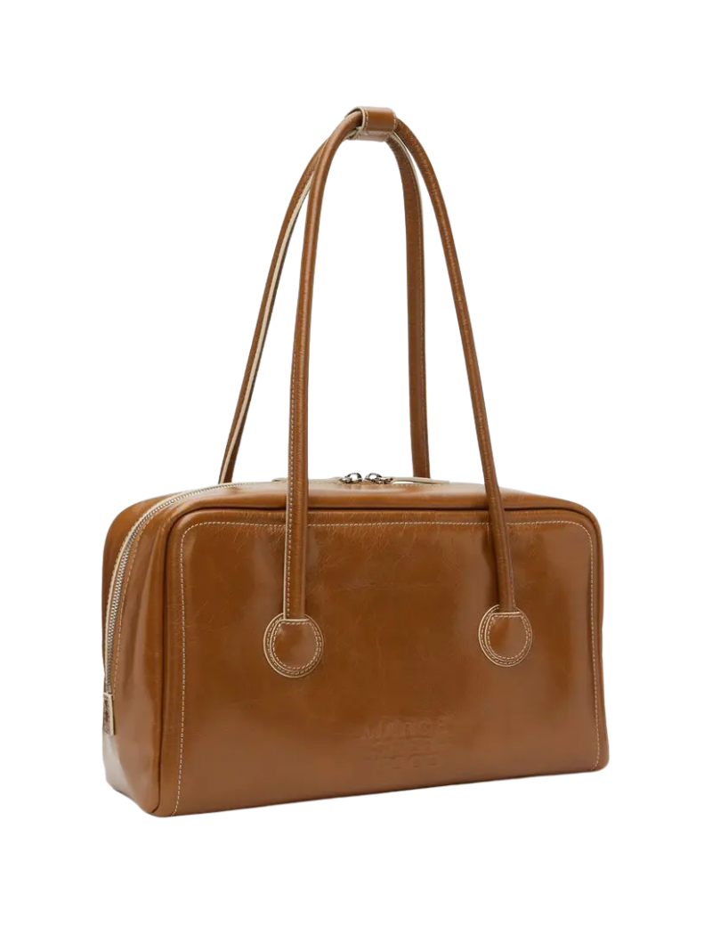 Bolso Soft Boston de Margesherwood. Un bolso de piel grande estilo baguette en color marrón, con el nombre de la marca grabado en la parte frontal.