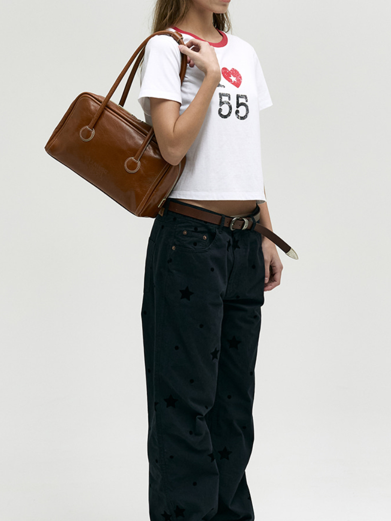 Tiene dos asas de piel para llevarlo al hombro o en la mano y una elegante fijador de correas para llevarlo al hombro de una manera más cómoda. Cierre de doble cremallera YKK y bolsillo de parche en el interior.
