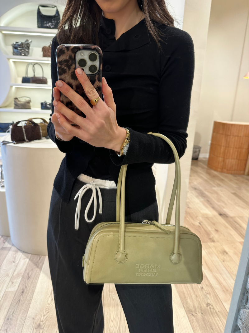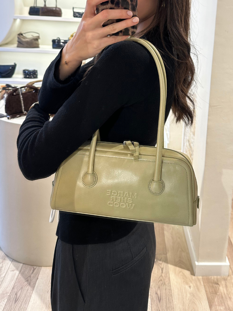 Bolso de hombro de cuero en color verde, con el logotipo de la marca grabado en la parte frontal y diseñado en la clásica forma baguette. El bolso cuenta con un bolsillo interior y un cierre de doble cremallera.