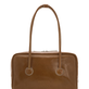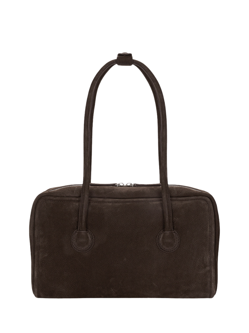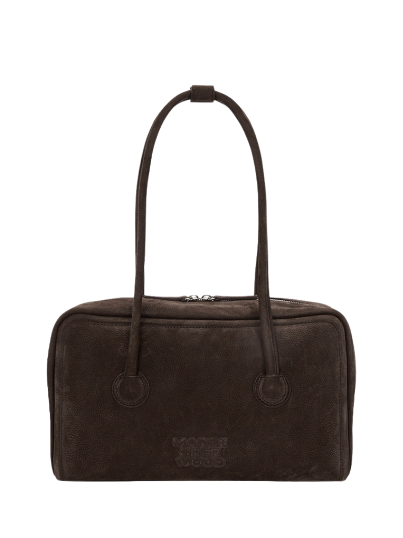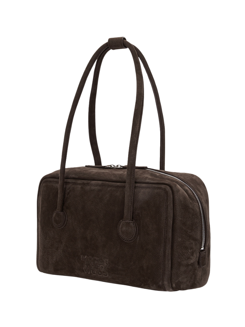 Bolso Soft Boston de Margesherwood. Un bolso de piel grande estilo baguette en color marrón, con el nombre de la marca grabado en la parte frontal.