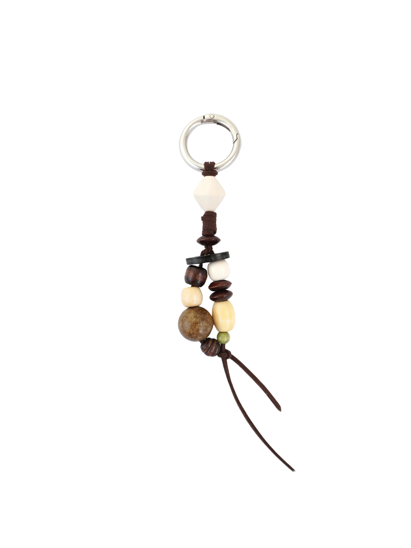 Charm pequeño artesanal de cuentas, diseñado con una mezcla de piezas en tonos madera, crema y chocolate que aportan un toque natural y cálido a cualquier bolso.