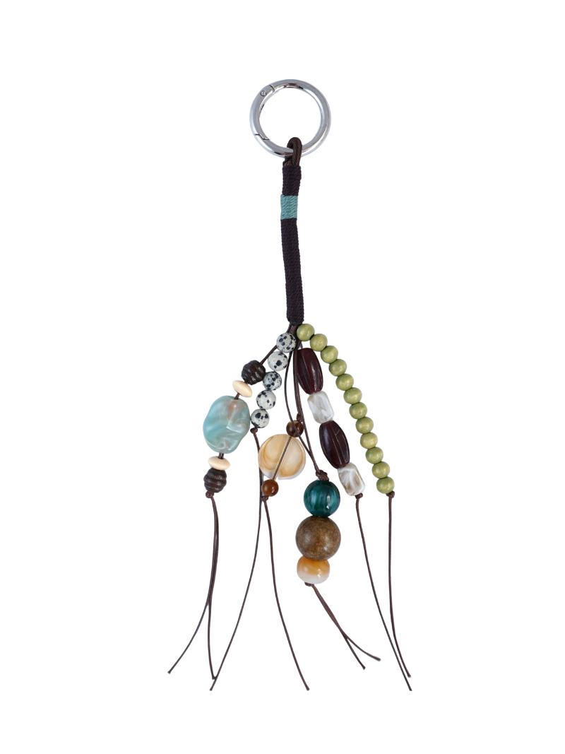 Charm artesanal de cuentas, diseñado con una mezcla de piezas en tonos madera, crema y chocolate que aportan un toque natural y cálido a cualquier bolso.
