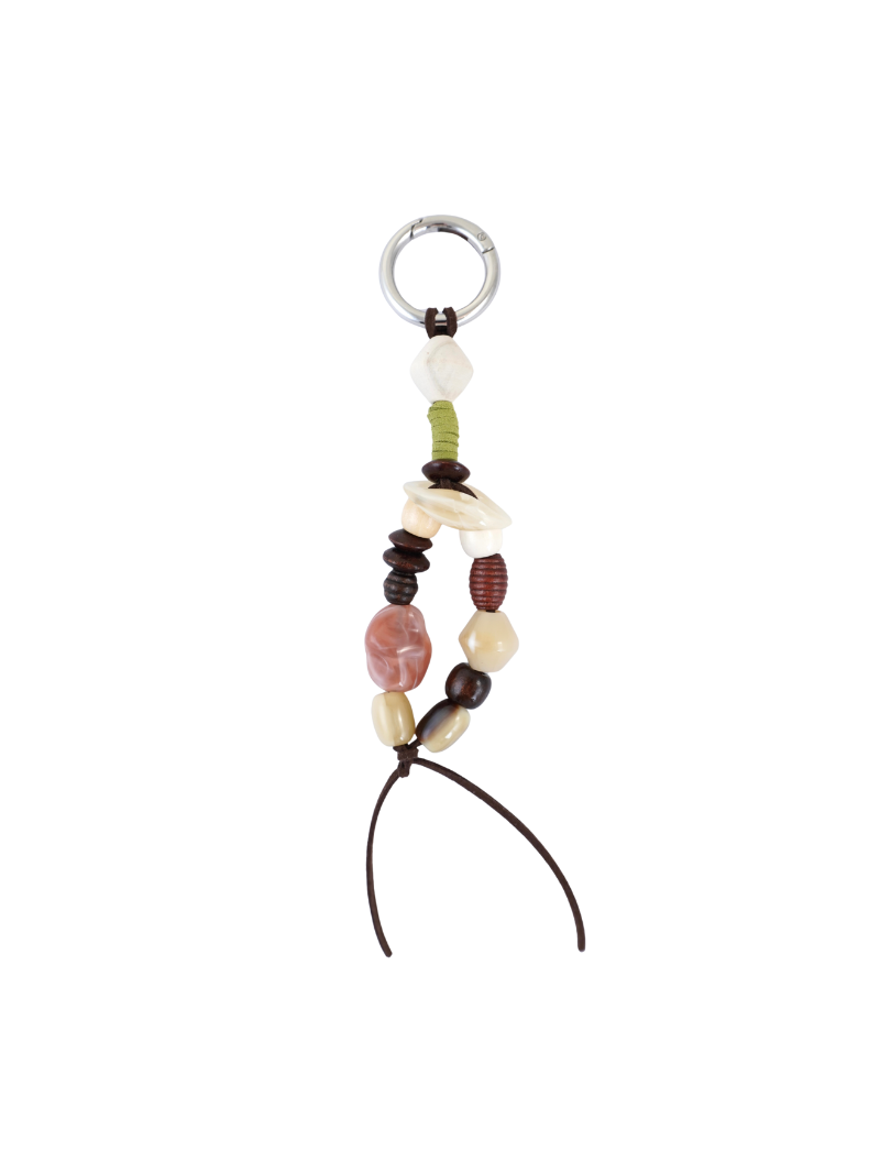 Charm pequeño artesanal de cuentas, diseñado con una mezcla de piezas en tonos madera, crema y chocolate que aportan un toque natural y cálido a cualquier bolso.