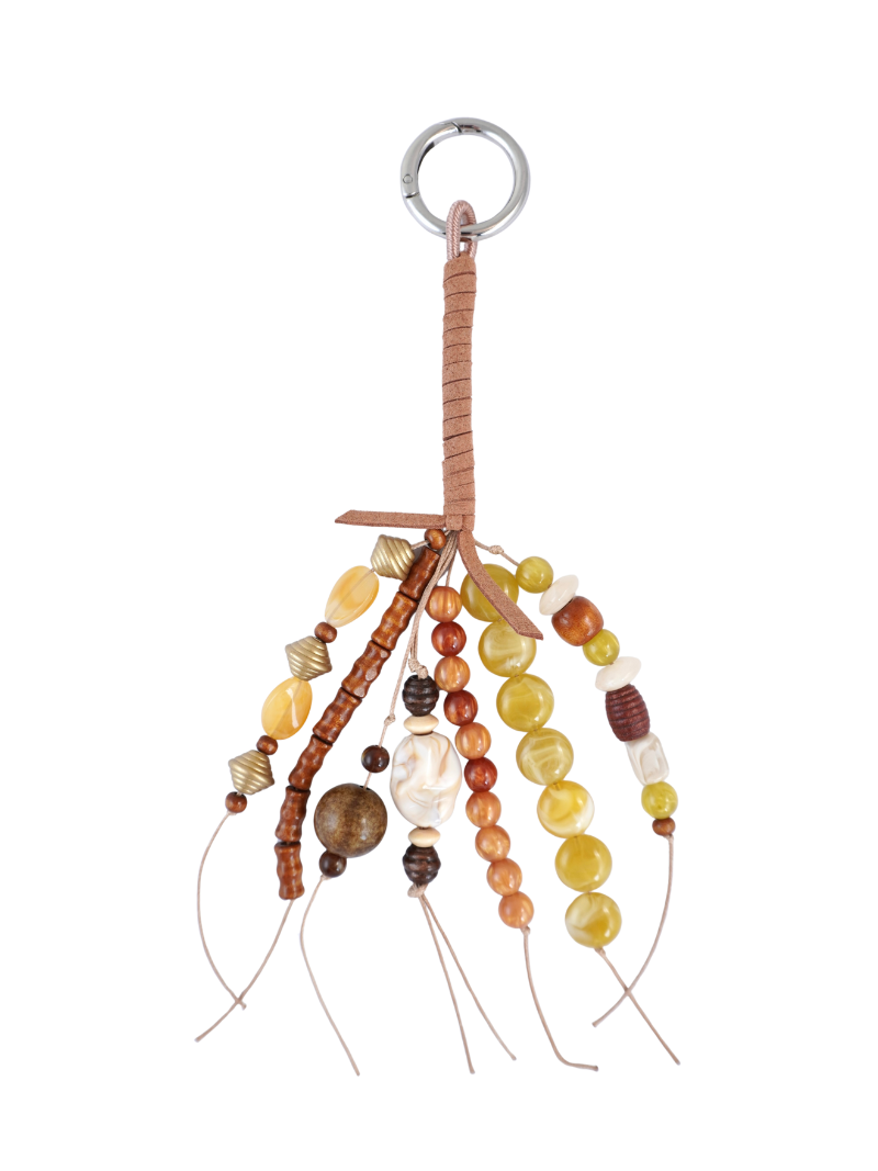 Charm artesanal de cuentas, diseñado con una mezcla de piezas en tonos madera, crema y chocolate que aportan un toque natural y cálido a cualquier bolso.