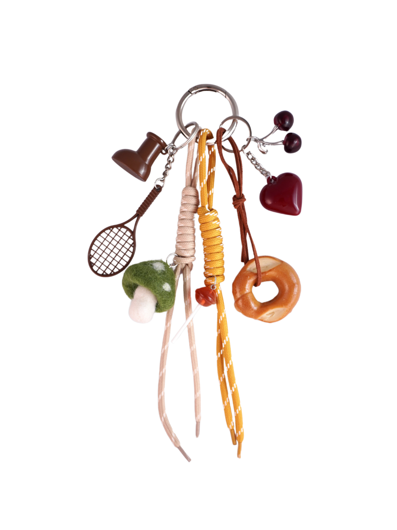 El Sundae Charm es un universo en miniatura. Incluye unas cerezas, una raqueta, un corazón, un champiñón de fieltro, un bagel, una bota, cuerdas trenzadas en tonos tierra y hasta una piruleta. ¿El resultado? Un accesorio caótico y delicioso, ideal para bolsos que necesitan diversión, textura y cero reglas.