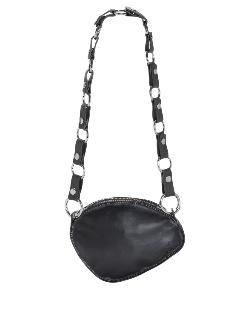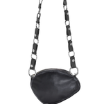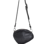 Bolso bandolera con forma ovalada de color negro, piel de vacuno “certificado LWG", estampado del logo en la parte delantera, con un asa para llevarlo a un hombro o cruzado. El asa es ajustable e intercambiable.