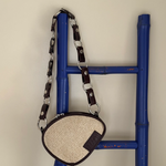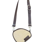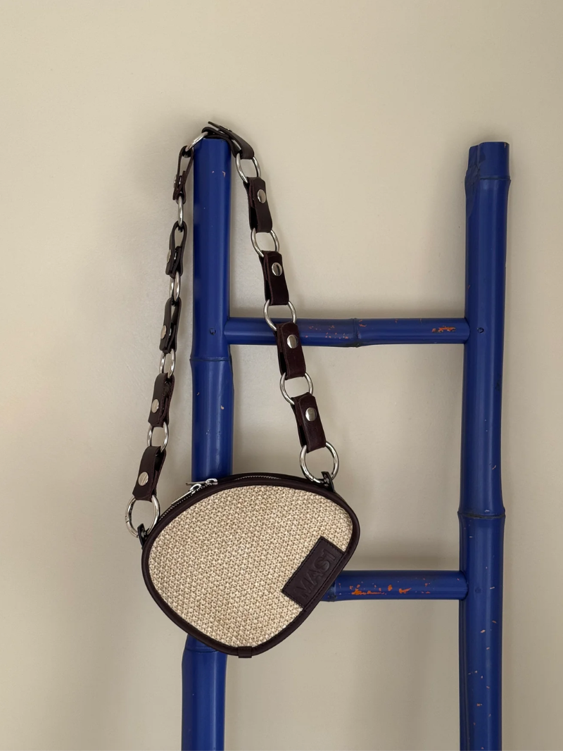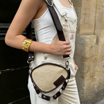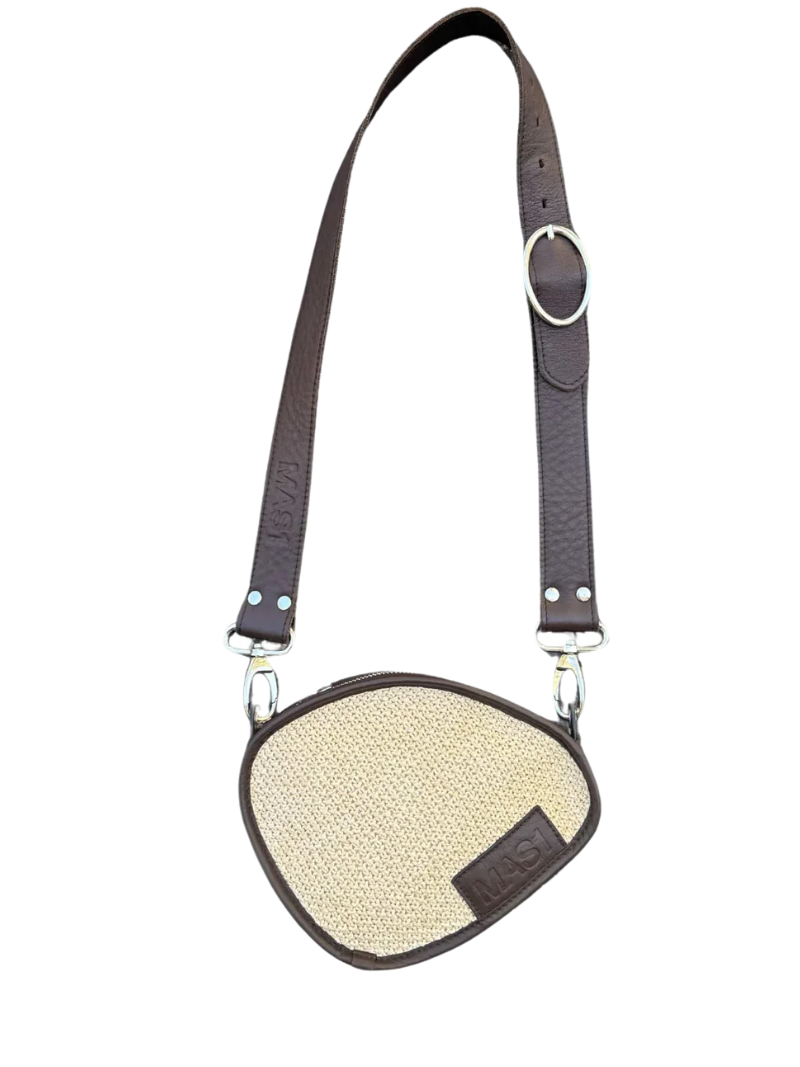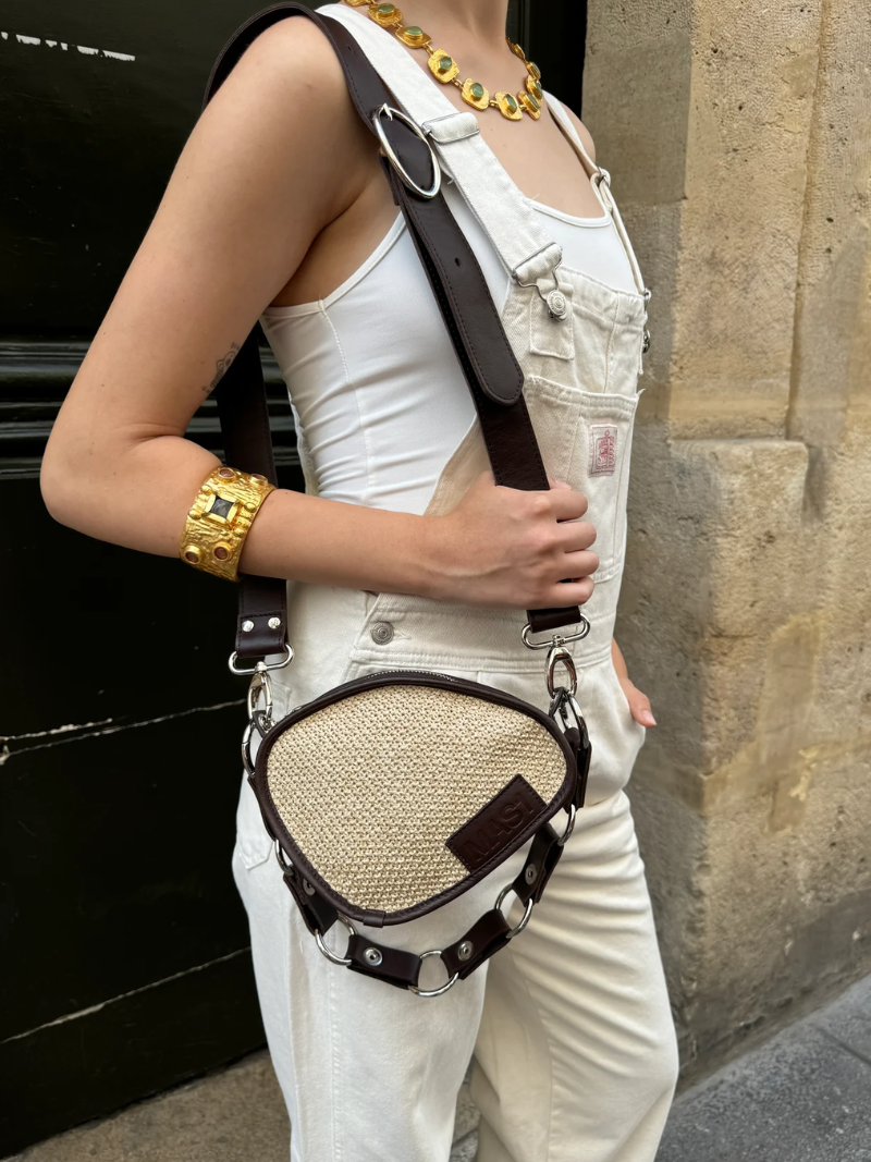 Bolso de rafia cruzado con diseño ovalado y un estilo único. Combina rafia 100% natural con piel de vacuno en color chocolate. Incluye asa ajustable e intercambiable: elige entre cadena lisa o cadena larga de círculos, y llévalo al hombro o cruzado.