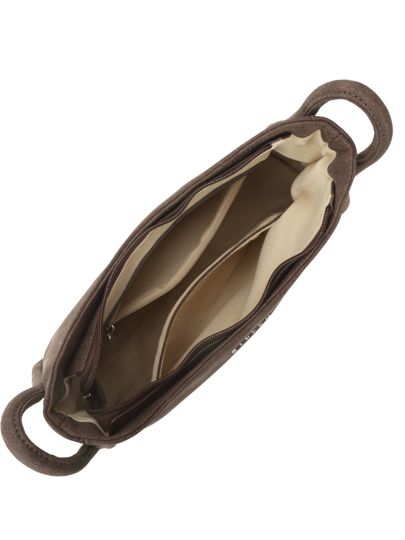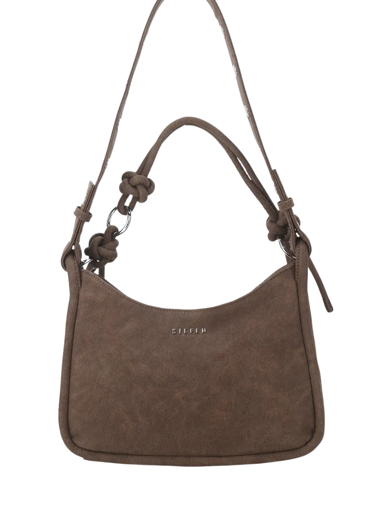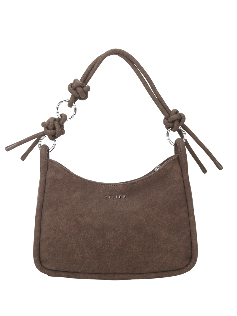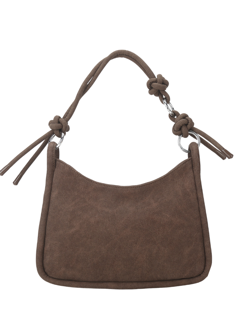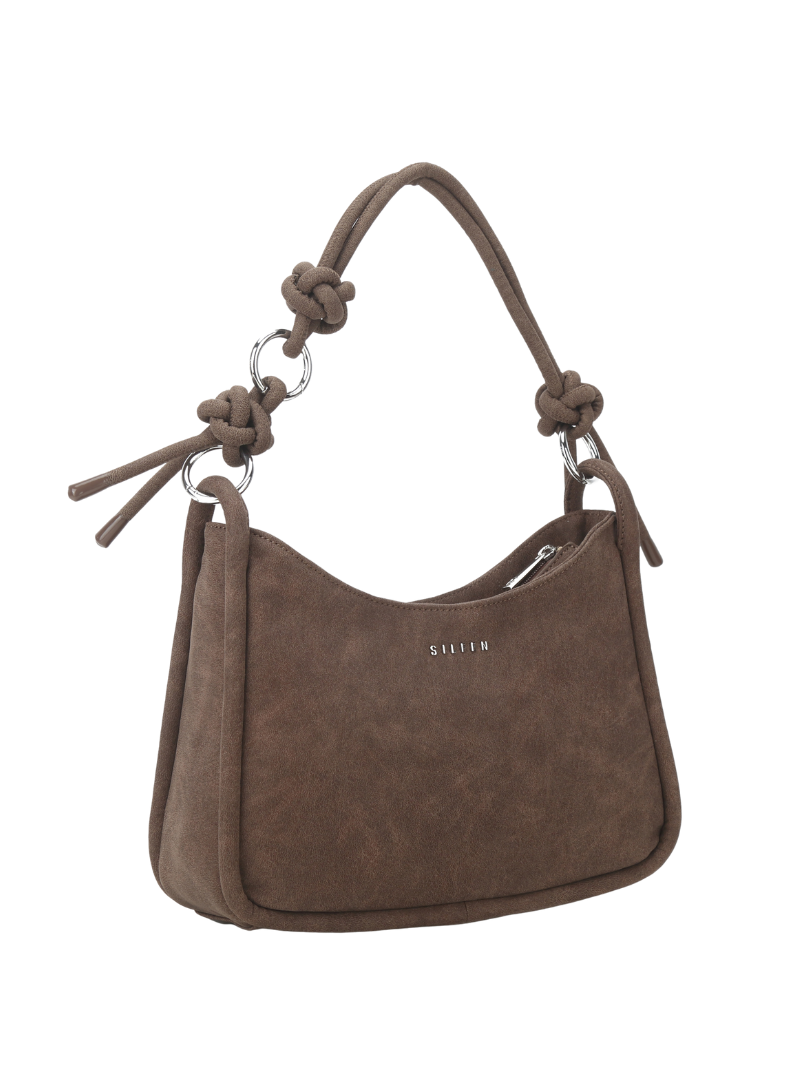 Bolso mediano de color marrón café perfecto para el día a día. Incluye un asa anudada con herrajes plateados y una correa ajustable para llevarlo al hombro o cruzado.