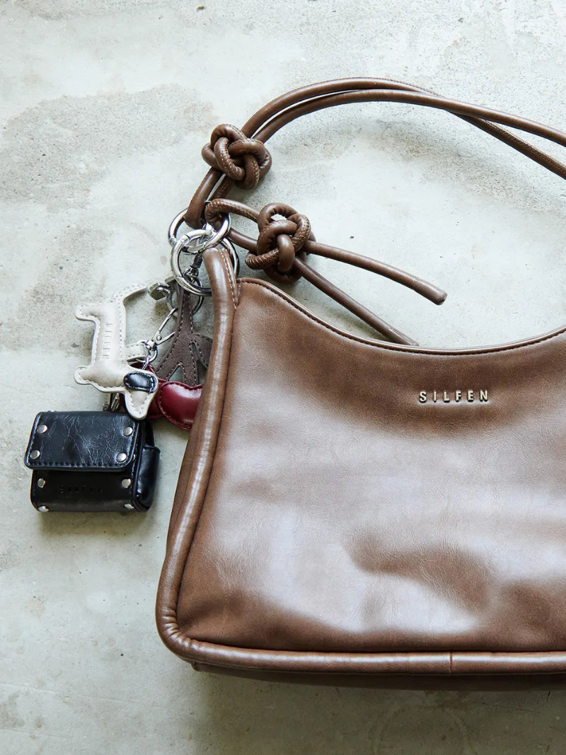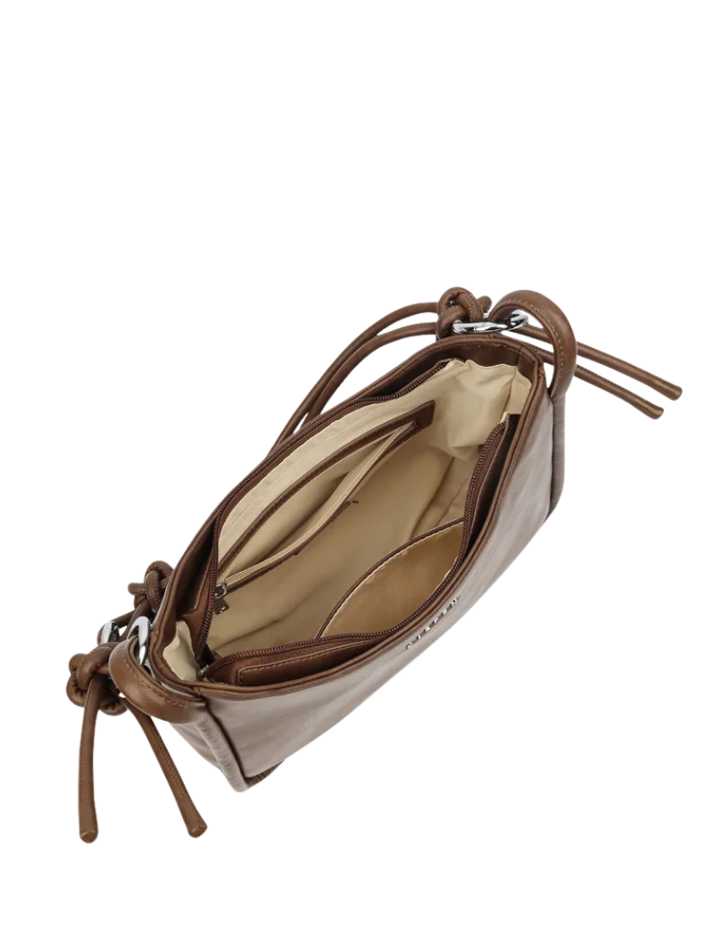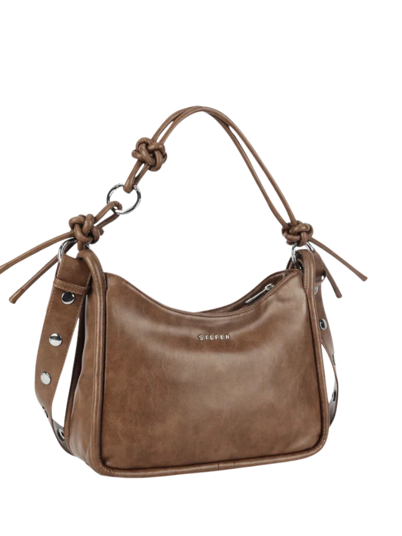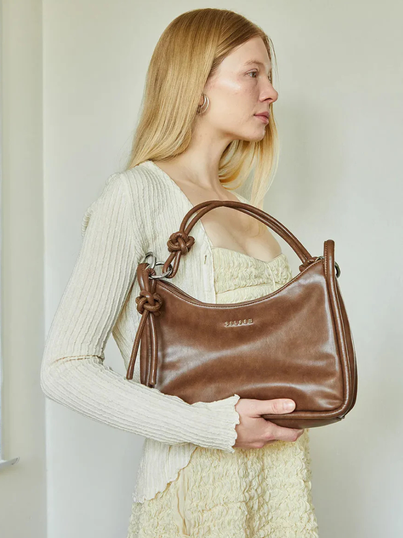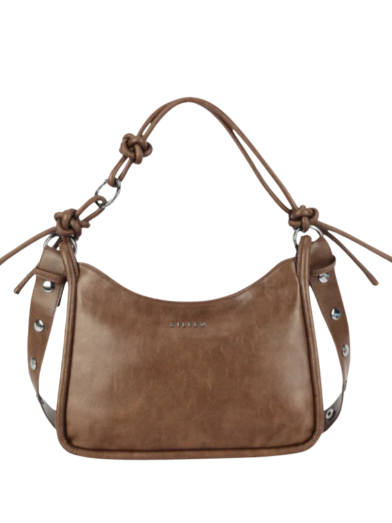 Bolso mediano de color marrón perfecto para el día a día. Incluye un asa anudada con herrajes plateados y una correa ajustable para llevarlo al hombro o cruzado.