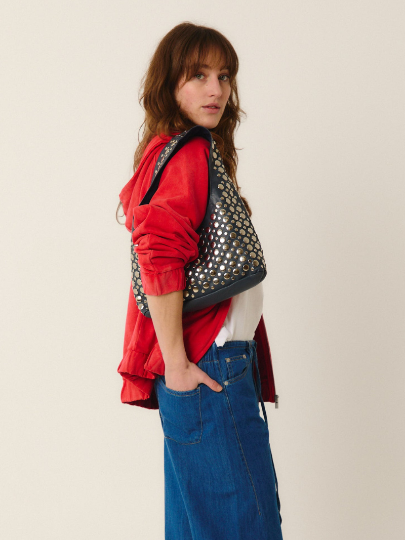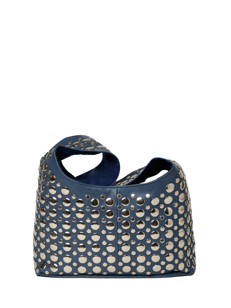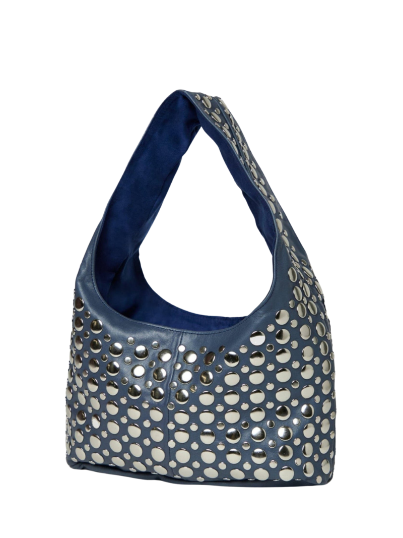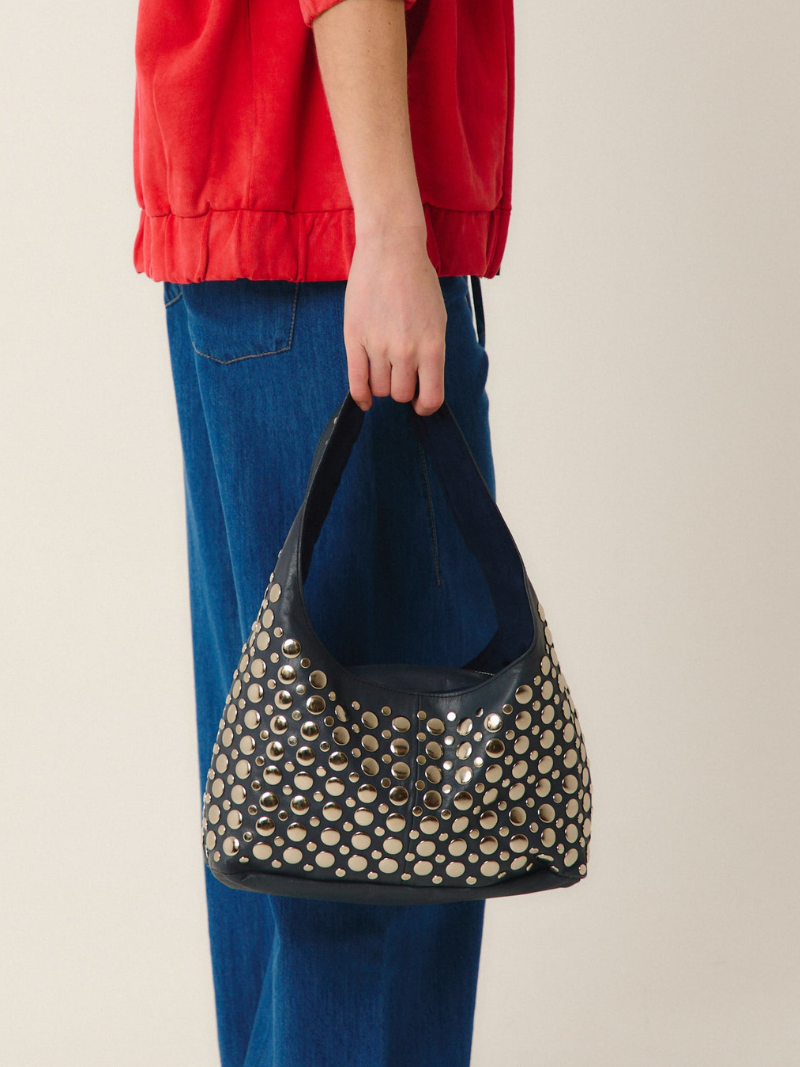 El Bolso de tachuelas Yamba azul marino destaca por su elegante diseño y tachuelas plateadas que le aportan un toque moderno y sofisticado. Su talla única es ideal para llevar lo esencial, combinando estilo y funcionalidad. Encuentra este accesorio imprescindible en Ferent Bags y eleva tu look diario con un toque de distinción.